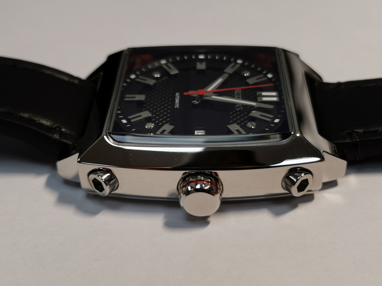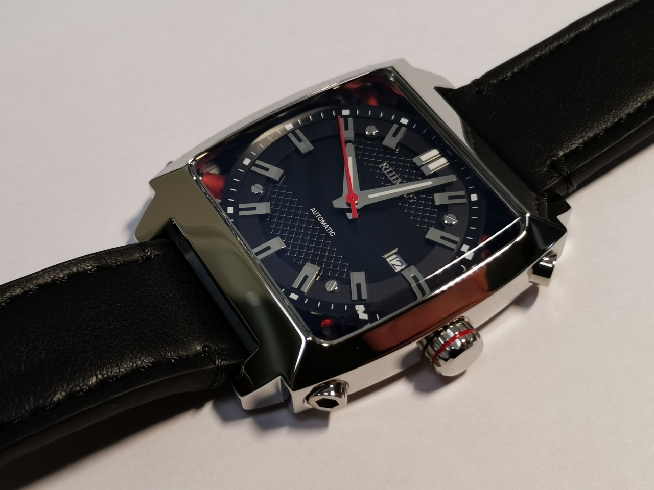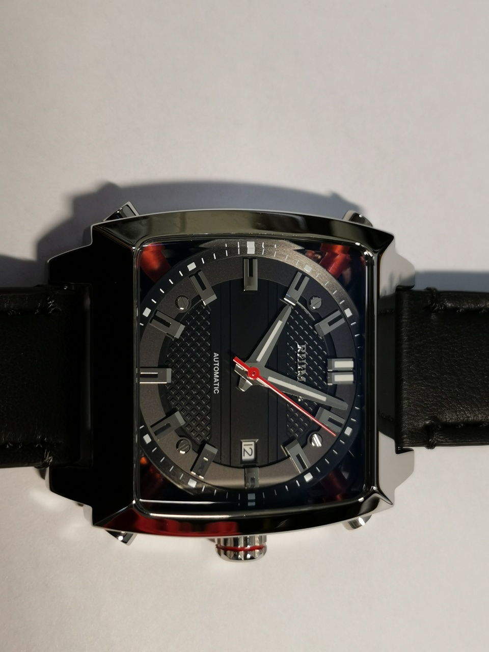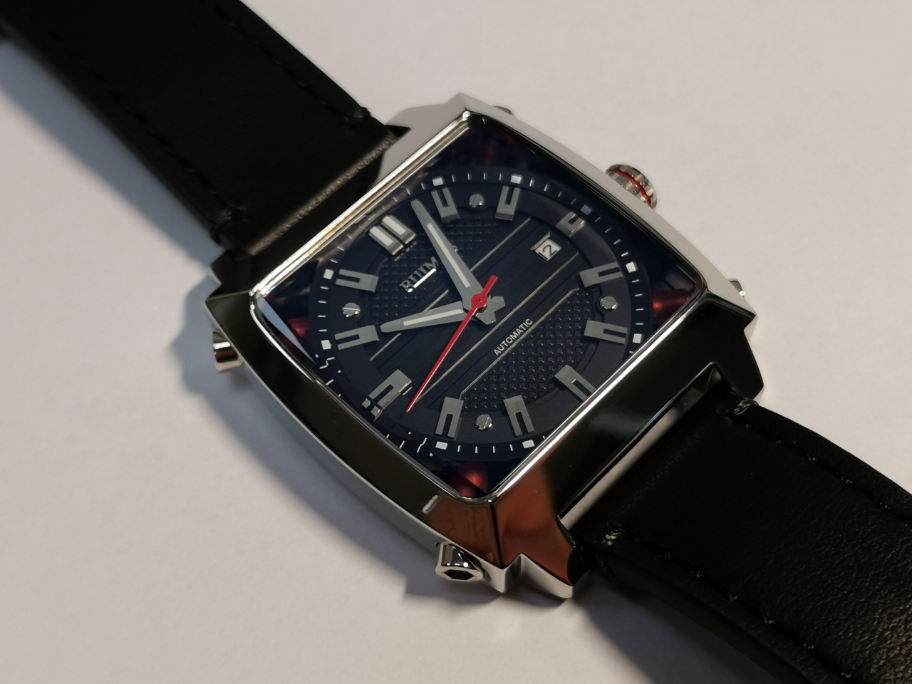 Теперь о часах: Часы изготовлены в квадратном корпусе из нержавеющей стали. С какого прототипа слизали дизайн я не задавался вопросом, он просто мне понравился, люблю квадратные часы. В качестве декоративных элементов корпуса, имеются некие винты с внутренним шестигранником, установленные под углом к корпусу, и уходящие глубоко, таким образом создаётся иллюзия, что они выполняют роль крепёжных элементов для механизма. Заводная головка крупная, имеет удобные насечки и красную полосу по периметру. Стекло над циферблатом минеральное, толстое, имеет скосы с теми же углами, что у корпуса. Циферблат многослойный с накладными часовыми обозначениями, объёмной брендовой надписью и 4 винтами, видимо для декора. Стрелки крупные трехгранные, имеют люм, довольно неплохой. Люм также имеет дата соответствующая 12 часам. Секундная стрелка красного цвета. В часах установлен механизм миёта 8215 с запасом хода, у моего экземпляра в районе 30-32 часов, при 40 оборотах заводной головки. Механизм шумноват как и все подобные. В целом часы выглядят приятно брутально, с диаметром корпуса 42мм без головки, 45мм с головкой, и 50мм от ушка до ушка. Ремешок кожаный двухслойный, толстый, сделан добротно. Бакля фигурная, с графировкой и полировкой.