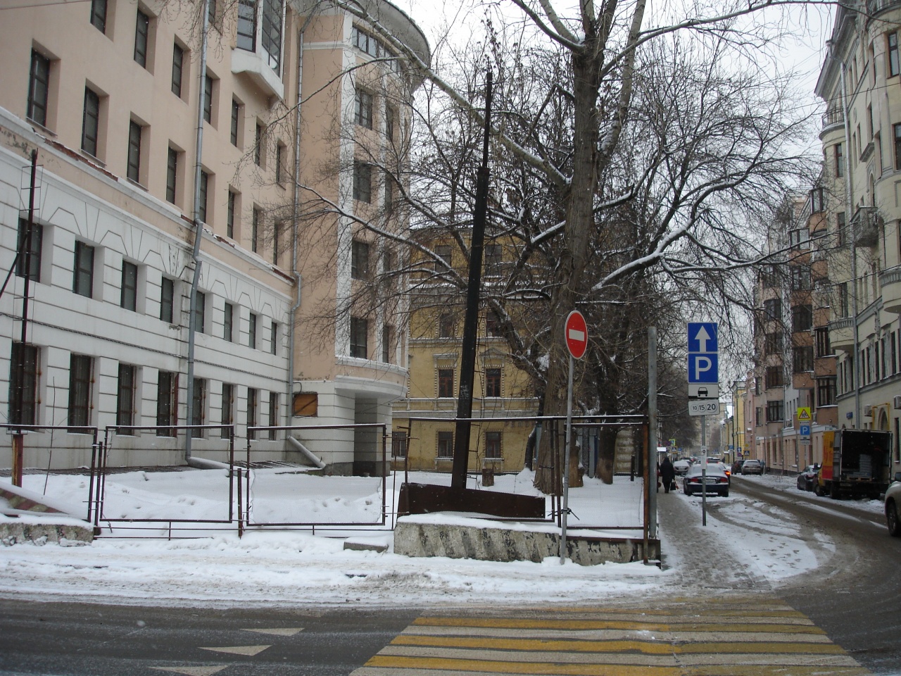 Примыкает к саду старинный особняк, раньше принадлежавший вроде даже как одному из Шереметьевых (хотя для него он невзрачный). На моей памяти все годы он принадлежит военной комендатуре. А вот на углу очень любопытный комплекс. Со стороны Басманной там шикарный особняк с флигелями. В каком-то из флигелей жил Чаадаев, а в особняке располагалось в советские времена аптекоуправление. И долгие годы его пытались прихватизировать обитатели секретного почтового ящика, расположенного чуть в глубине и по переулку. Организацию создал и возглавил Аксель Иванович Берг, а я имел честь ездить туда на всякие согласования со средины 80-х до средины 90-х. Поэтому, собственно, и в курсе, что все разработки заканчивались главой: «А что бы все это заработало, надо передать нам здание аптекоуправления»)))). Сотрудники там были все заслуженные и, как на подбор, именовались: Моисей Хаимович, Оскар Мовшович, Гирш Абрамович. Почему задания на поездку нам давали в таком стиле: «Так, капитан. Завтра едешь в Синагогу. Там обсуждение эскизного проекта…» Однако сейчас в вожделенном здании располагается какое-то учреждение культуры (типа «Хор им. Пятницкого»). А с парадного входа «Синагоги» отделение Ростехнадзора. Куда делись кузнецы оборонного щита – одному еврейскому богу известно.