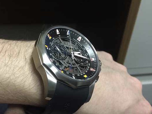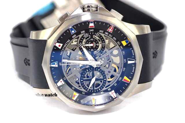 Admiral's Cup Legend 47 Chronograph Squelette из титана 5-го класса, скелетонизированым серым циферблатом с красочными навигационными вымпелами. Модель Admiral's Cup Legend 47 Chronograph Squelette была запущена в 2016 году, оснащена функцией хронографа. Крупный корпус диаметром 47 мм, изготовлен из титана 5-го класса, толщиной 15,65 мм, сложной формы с двенадцатью гранями, обрамлен сапфировым стеклом с обеих сторон.