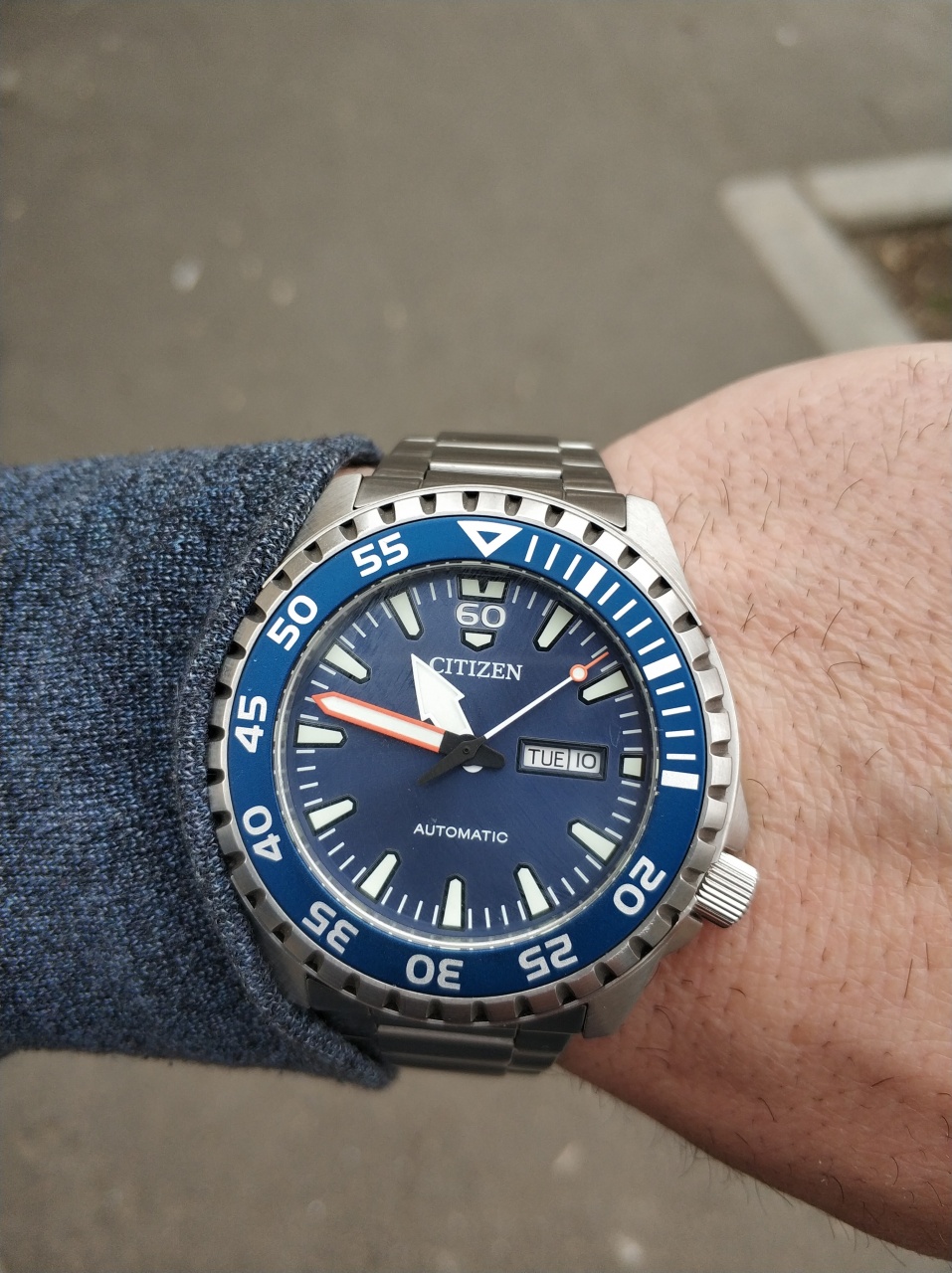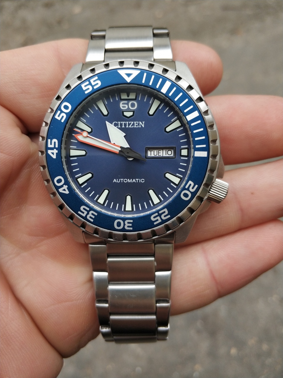 Часы б/у, покупал в августе 2019 . Состояние очень хорошее, не скажу отличное, потому что когда фотографировал чтоб выложить, увидел две точечки на безеле, между 45 и 50. На браслете есть небольшие потертости и царапинки, в основном на замочке, на фото видно. Продаю потому что брал из за внешнего вида и хотел попробовать механику. Они красивы, но вот механика, это не мое, буду брать Eco-Drive.