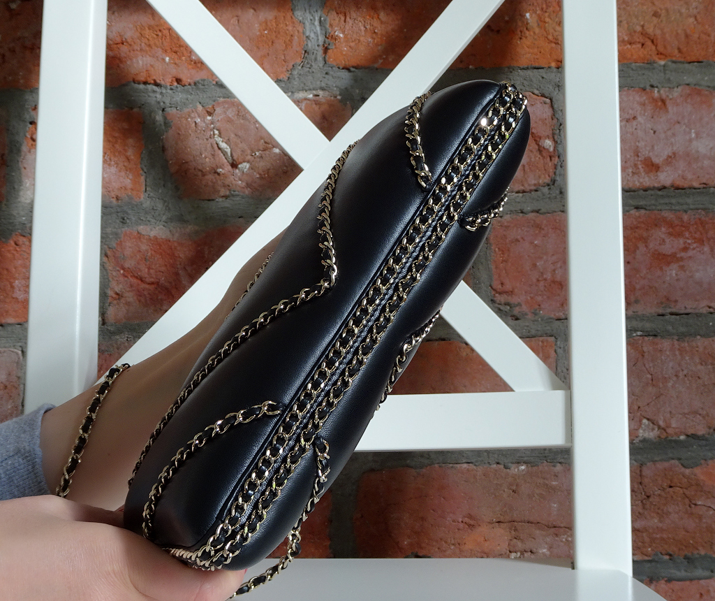 Сумка смотрится очень лаконичной внешне, при этом, если разобраться - ее оформление очень навороченное и непростое. Сумка очень интересно декорирована в культовом стиле Chanel который называется Chain Around - когда сумка по кругу как бы обернута одной или несколькими цепочками. В каждую цепочку при этом продета еще и кожаная лента - фирменный стиль Chanel в каждой детали. И даже это еще не все: спереди и сзади сумки, также цепочками выполнен узор "шеврон" - диагональные полосы - один из самых модных узоров новых коллекций Chanel.
