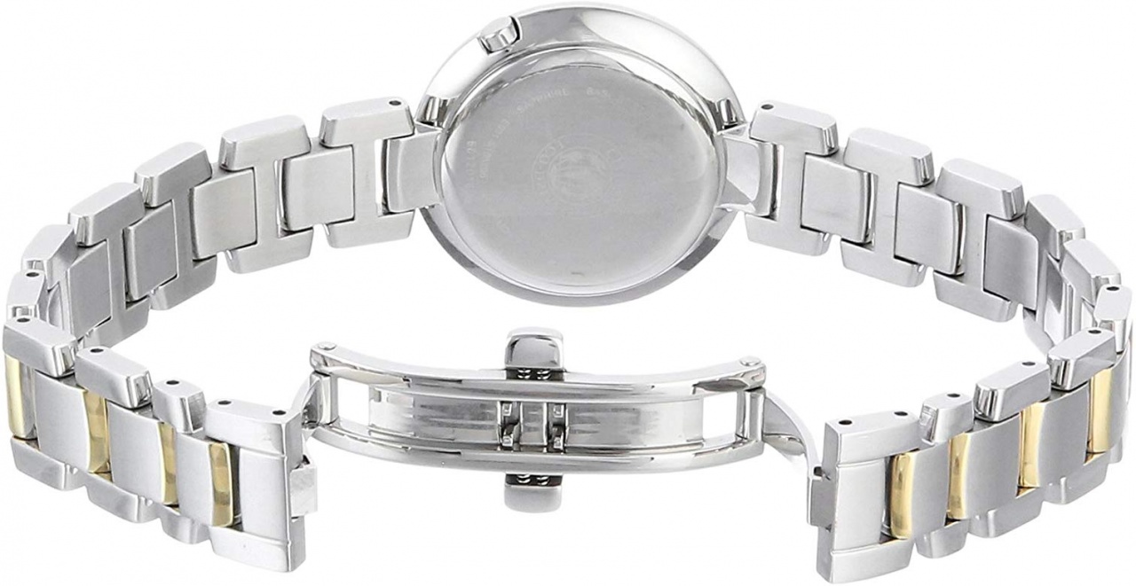 Корпус и браслет из высокотехнологичной нержавеющей стали серебристо-золотистого цвета.