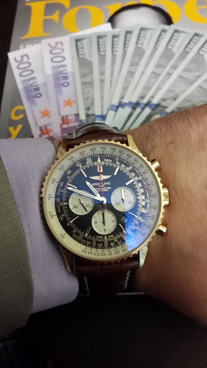 Продам золотые часы BREITLING NAVITIMER 01 46 мм. Золотые 750 проба, 84 грамма золота. Лимитированная версия, всего 200 штук выпущено, эти 28. Состояние идеальное. Носил очень мало и аккуратно. Покупались в магазине швейцарских часов Консул на Тверской за 1 597 770. Все документы и чеки есть. В подарок черный ремешок из аллигатора.