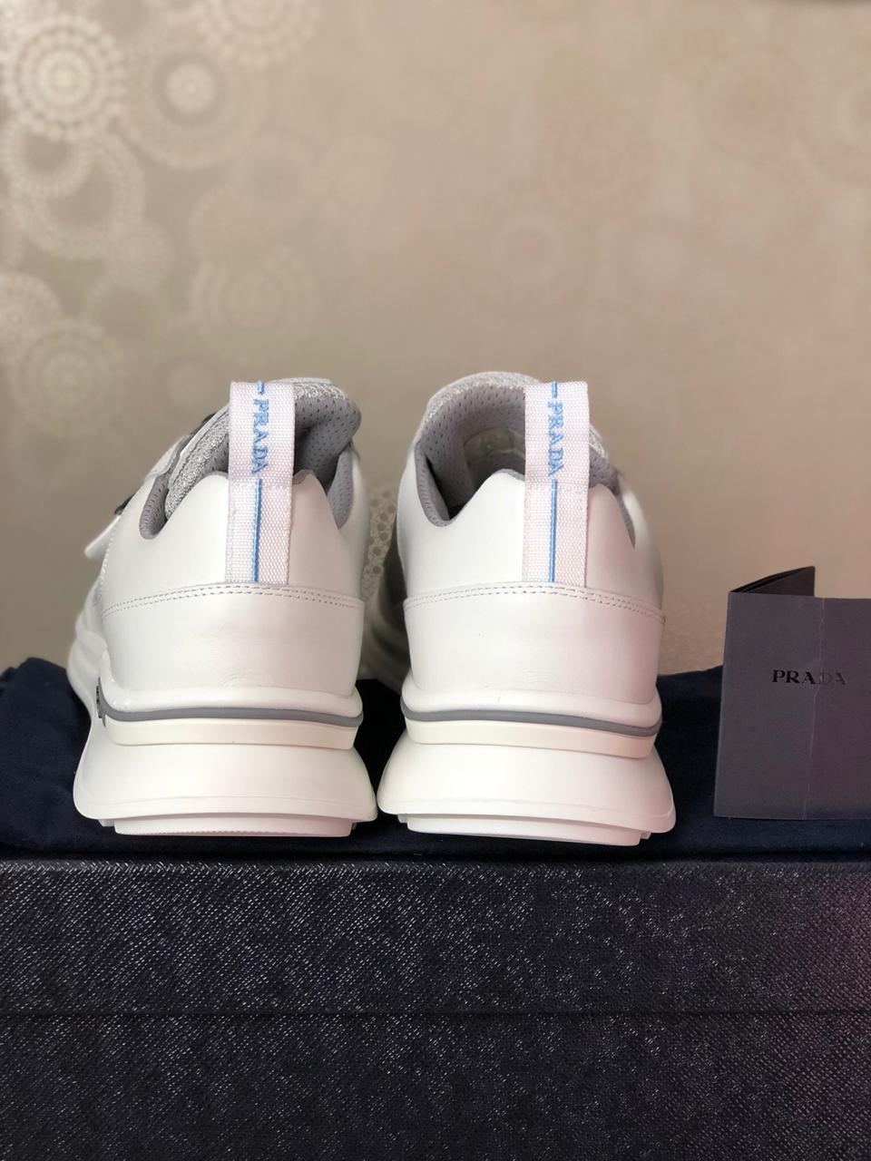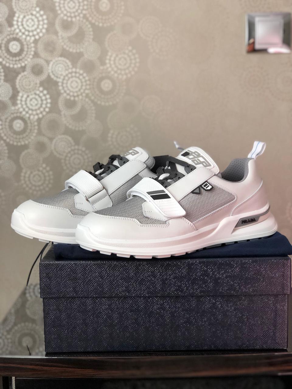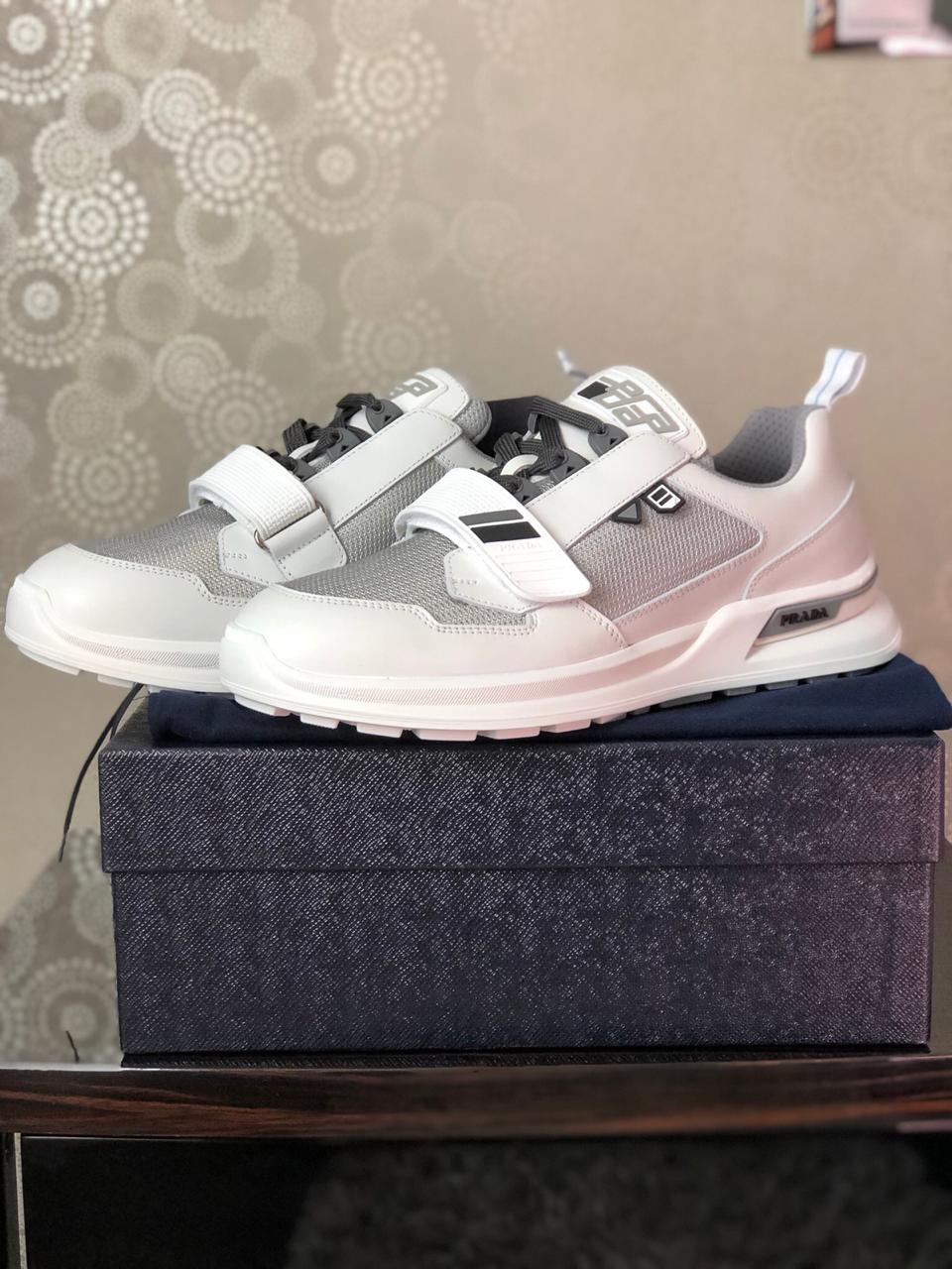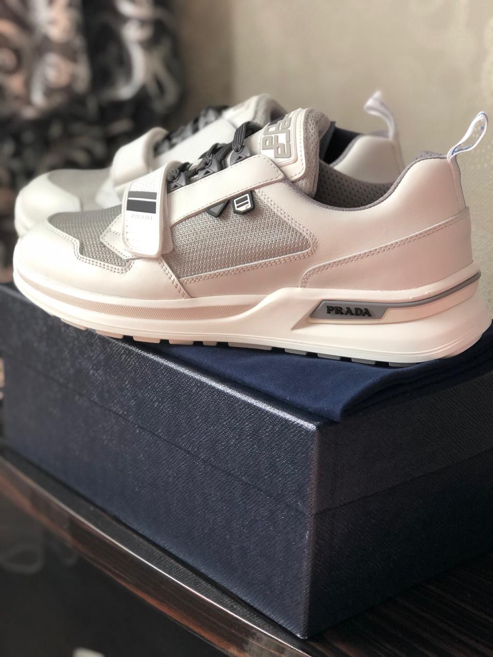 В продаже,новые мужские кроссовки от известного дома моды PRADA.Итальянский бренд активно использует при создании моделей грубые технические материалы,футуристичные резиновые нашивки-логотипы,графичные принты.Так,модный дом сезон за сезоном удивляет публику своими антиутопичными коллекциями.Подтверждение тому-кроссовки Mechano белого и серого цвета.Модель изготовлена из кожи со вставками из нейлона имеет петлю для подтягивания сзади,внуровку спереди,застёжку на липучке,верх в сетку,кожаные вставки и плоскую резиновую подошву.