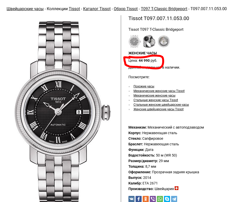 [Женские] TISSOT Bridgeport Ladies Auto T0970071105300. Черный цифер / Браслет / d=29mm - Часовой форум Watch.ru