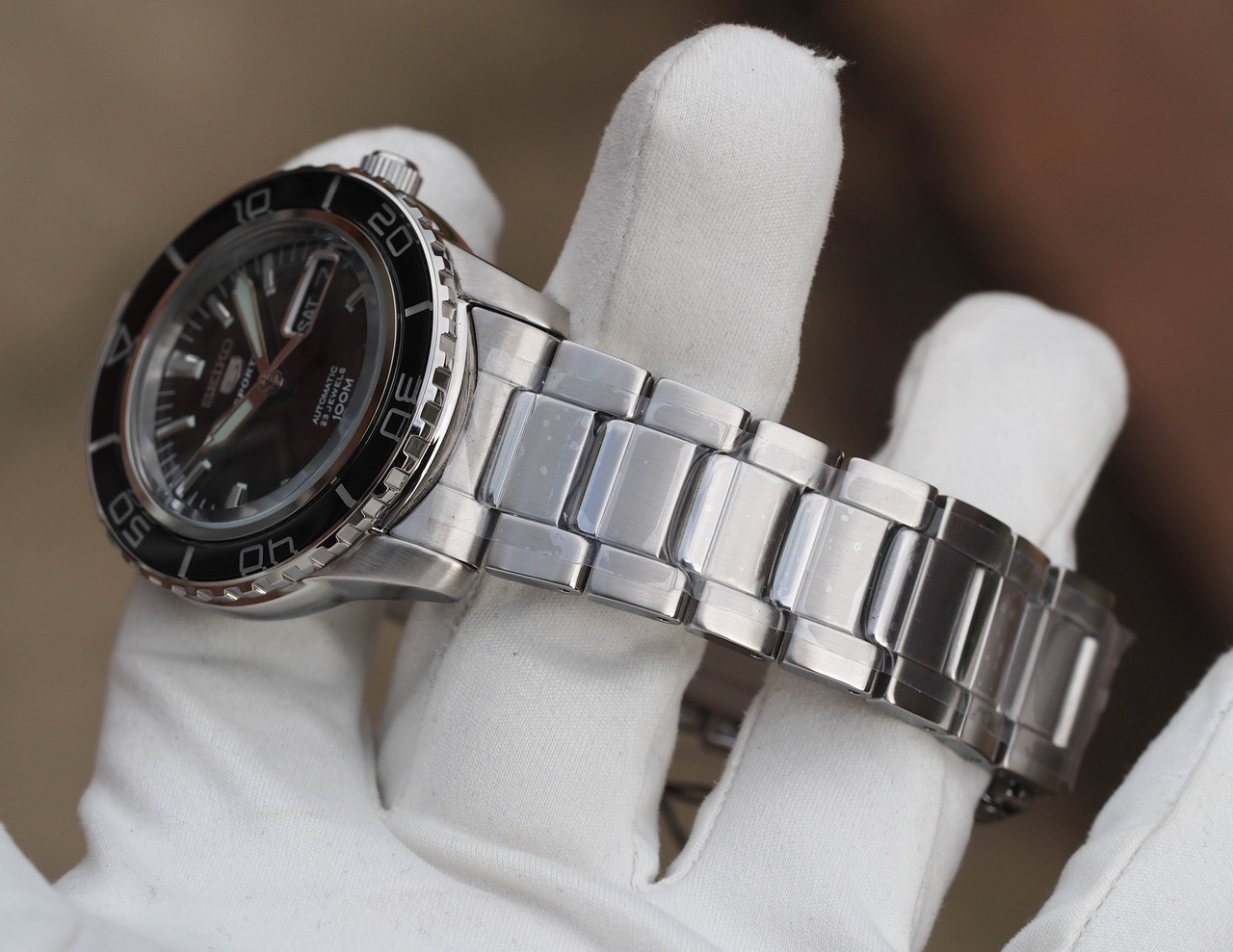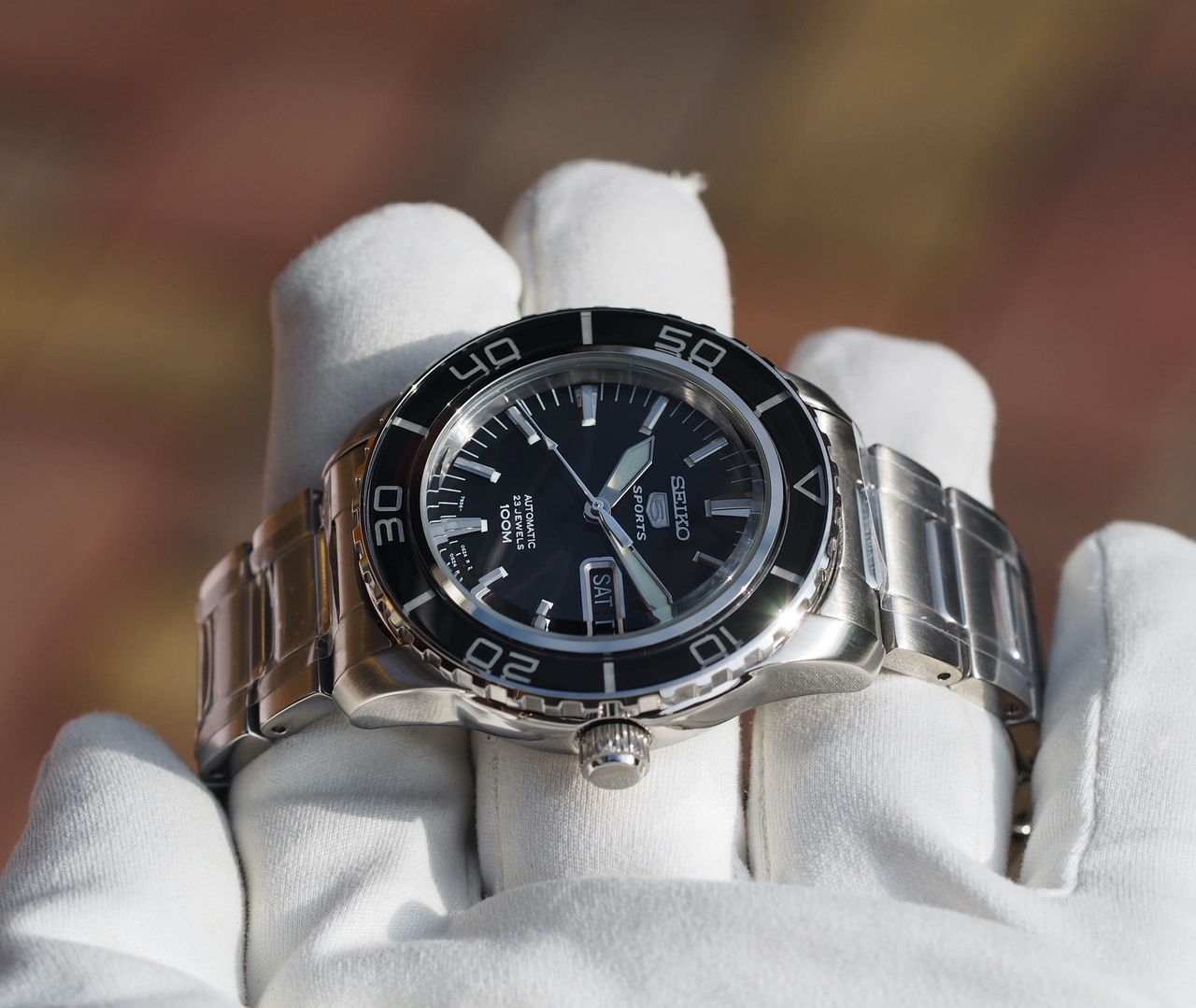 Черный циферблат, накладные метки, окантовка даты и лого Seiko 5