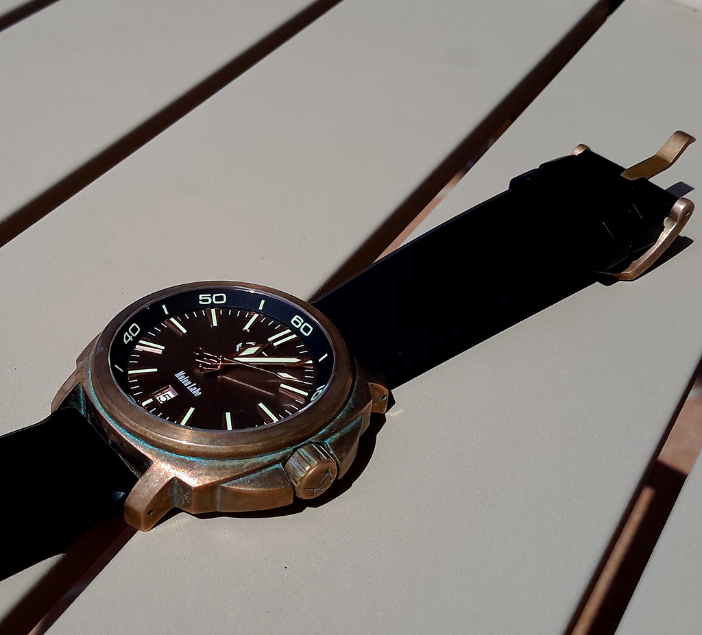 Тоже приобрелся случайно, после других «цветняков». Наигравшись с другой«бронзой», по прошествии некоторого времени, душа все-таки потребовала чего-то этакого. Много денег тратить не хотелось, поэтому был взят этот «кикстартеровский» продукт. Часы достаточно толстые, плюс ремешок, но они больше таскаются летом, с футболками, поэтому толщина некритична. В целом, от MolonLabe, складываются достаточно хорошие впечатления. А учитывая их цену - просто совсем хорошо, но ждать чего-то сверхвыдающегося от них тоже не стоит.