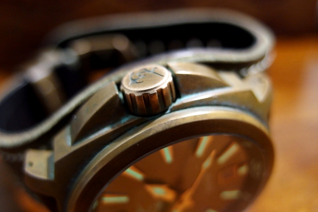 Закручивающаяся заводная головка из бронзы, защищенная наплывами корпуса с обеих сторон.