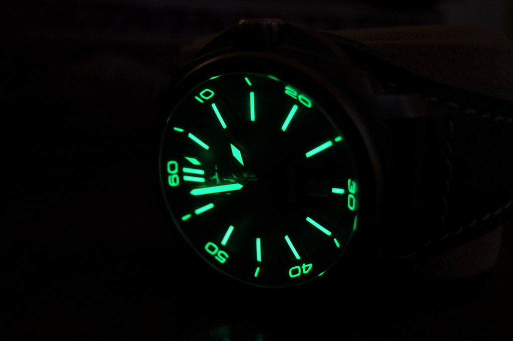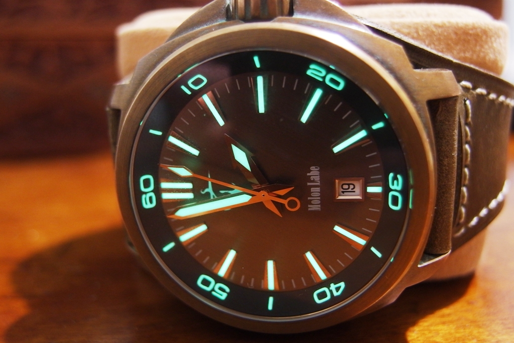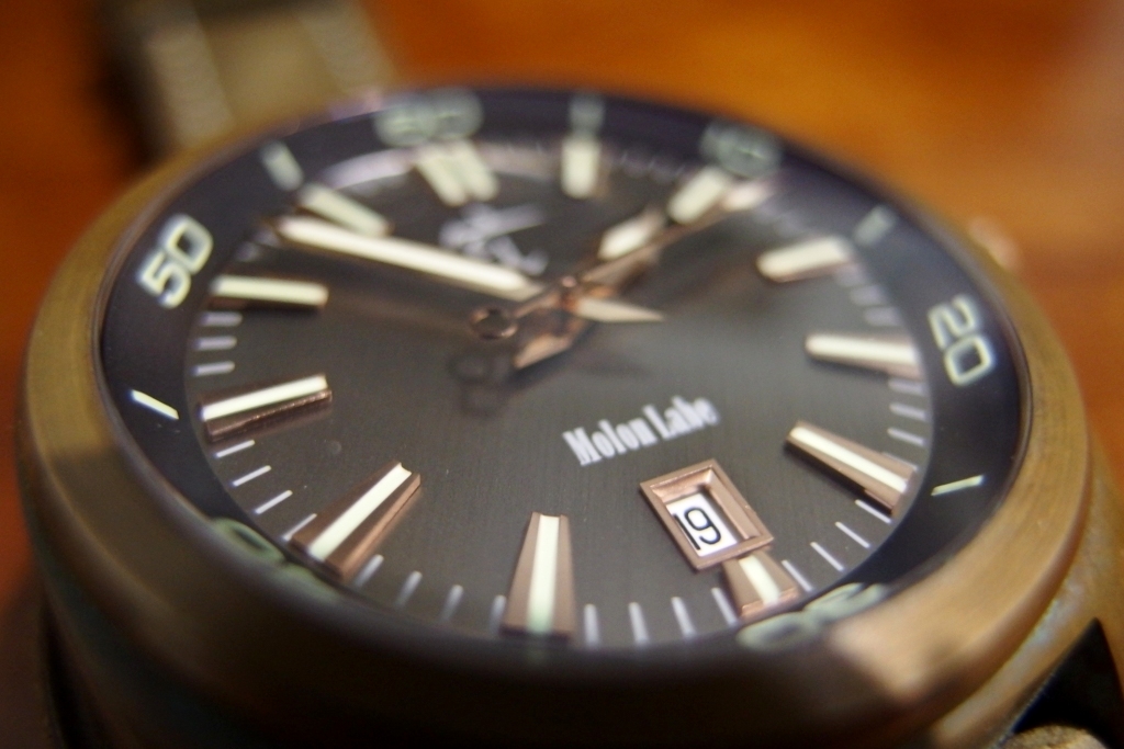 Сапфировое стекло с антибликом и некоторой купольностью. Циферблат бронзового цвета и, даже, с какой-то полосатой отделкой. Накладные часовые метки цвета полированной бронзы, но не бронза. Стрелки такого же цвета, как и метки, но тоже не бронза. Индикация часов, минут, центральная секундная стрелка и кривовастенькая дата на 6 часах. Стрелки и метки покрыты люминисцентным составом. Достаточно чахлым, если сравнивать с некоторыми другими моими часами. Светят зеленым светом ярко, но недолго.
