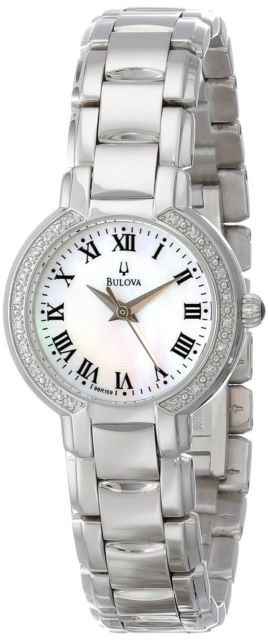 Изящные женские часики в прочной стали корпуса и браслета с инкрустацией бриллиантами и перламутровым циферблатом.
