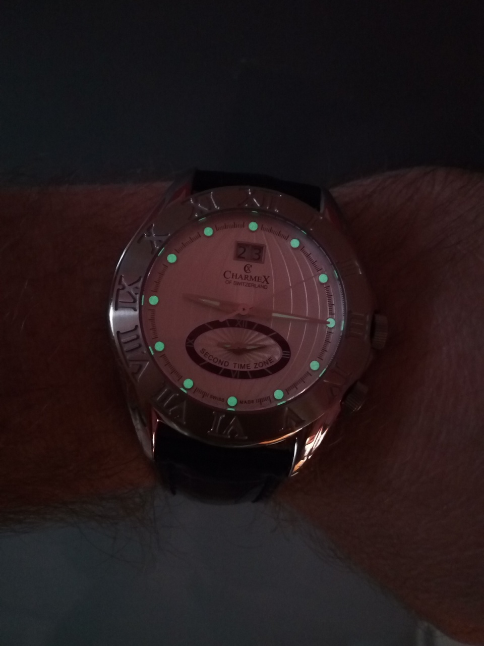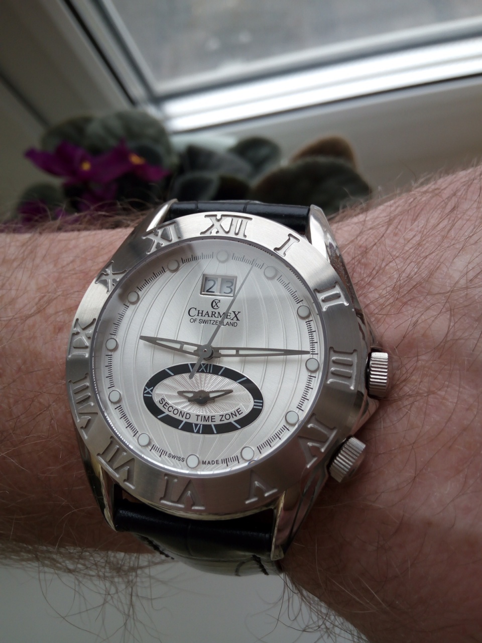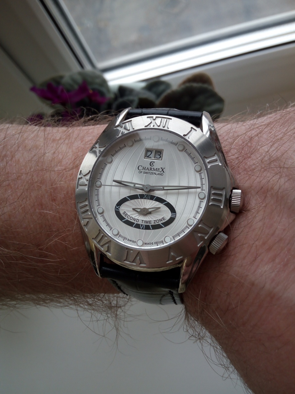 Вторая часовая зона на отдельном циферблате, гравированный безель, солидный мужской размер, отличная отделка корпуса. Часы в хорошем состоянии, стекло чистое, по корпусу минимум следов эксплуатации, на задней крышке - пленка.