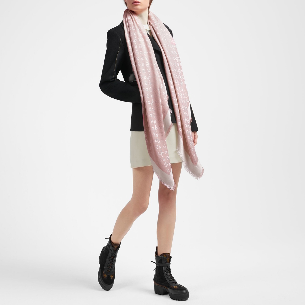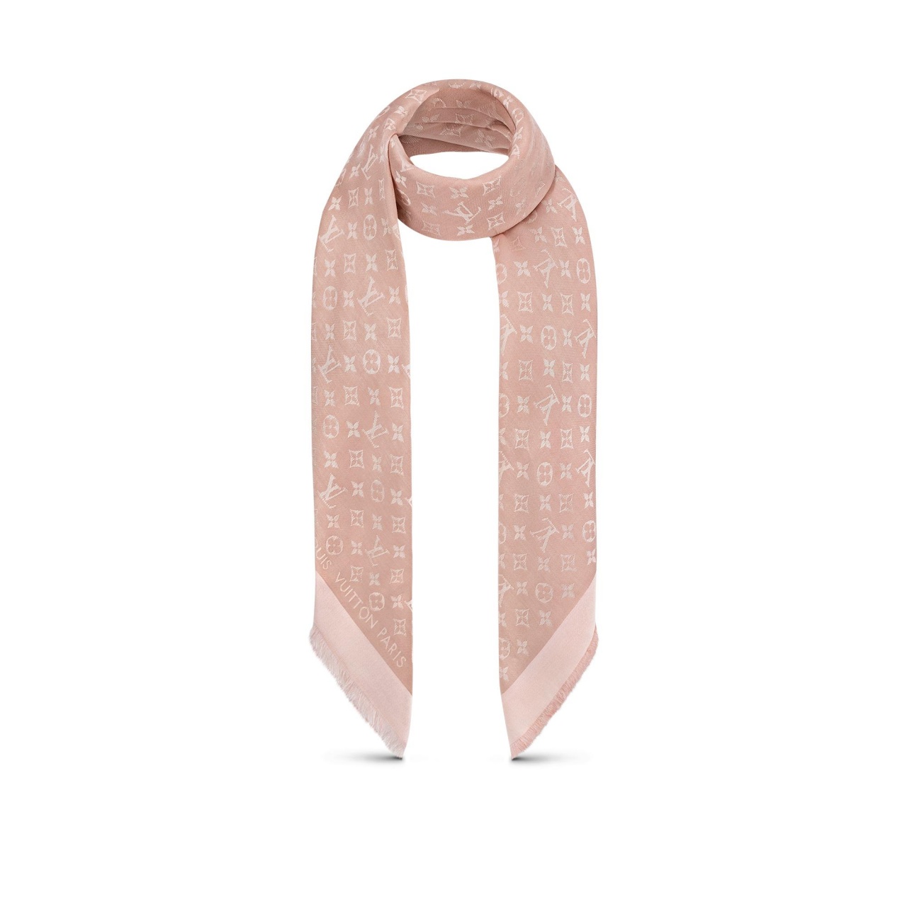 "Роскошная мягкая шаль Monogram Denim, воплощение изящества и женственности, станет незаменимым аксессуаром на каждый день. Рисунок Monogram, заполняющий всю поверхность шали, дополнен надписью Louis Vuitton."