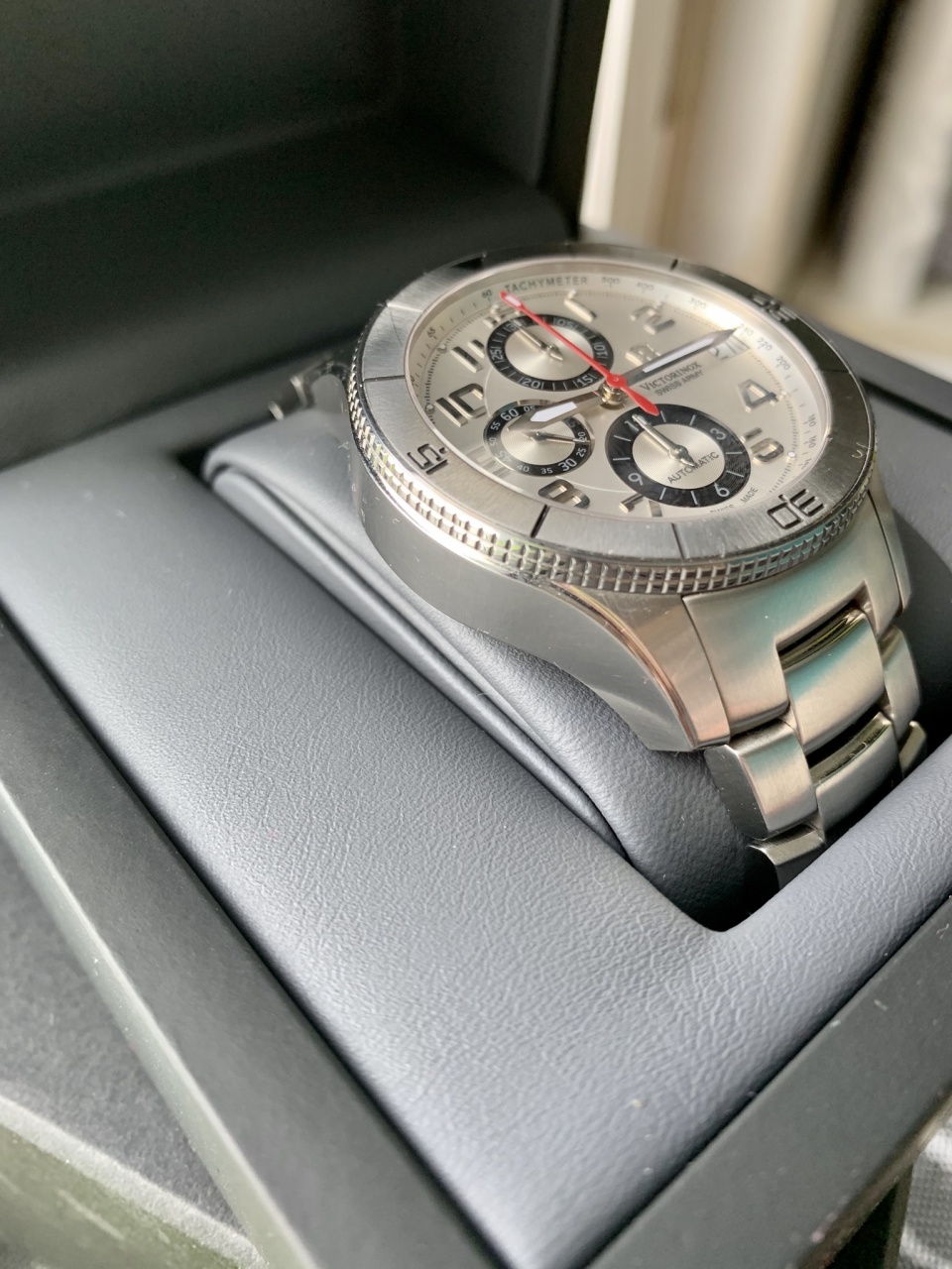 Продам механический хронограф от Victorinox, часы 2017 года, покупались примерно год назад у предыдущего владельца, в комплекте две коробки, книжка и незаполненная карта. Часы в хорошем состоянии, носились не часто, браслет полный. Достаточно массивные и увесистые часы диаметр 45 мм. Механизм в часах проверенный временем Valjoux 7750, водозащита 100 м, сапфировое стекло.