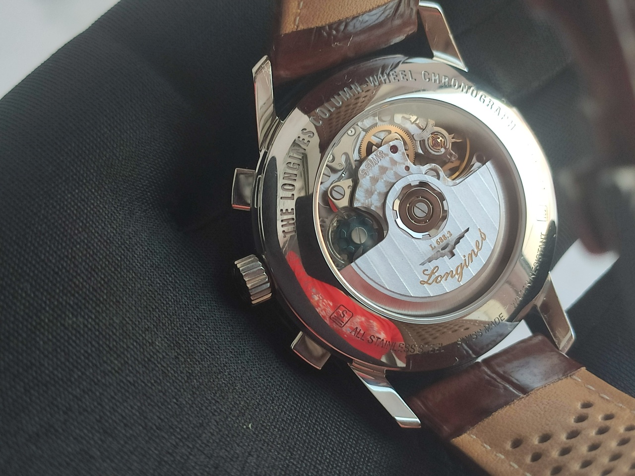 Механизм: Механический хронограф с автоподзаводом, калибр L688 (на основе ETA A08.L01), колонное колесо. Запас хода до 54 ч.