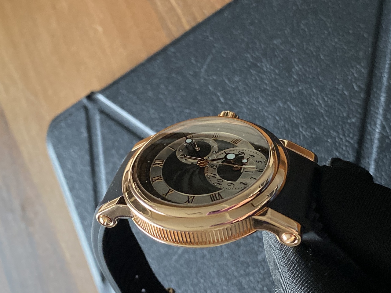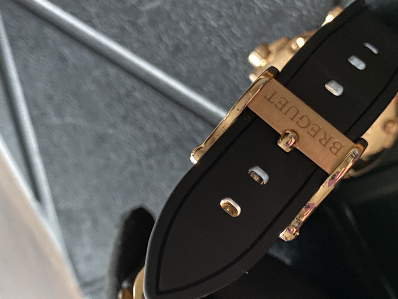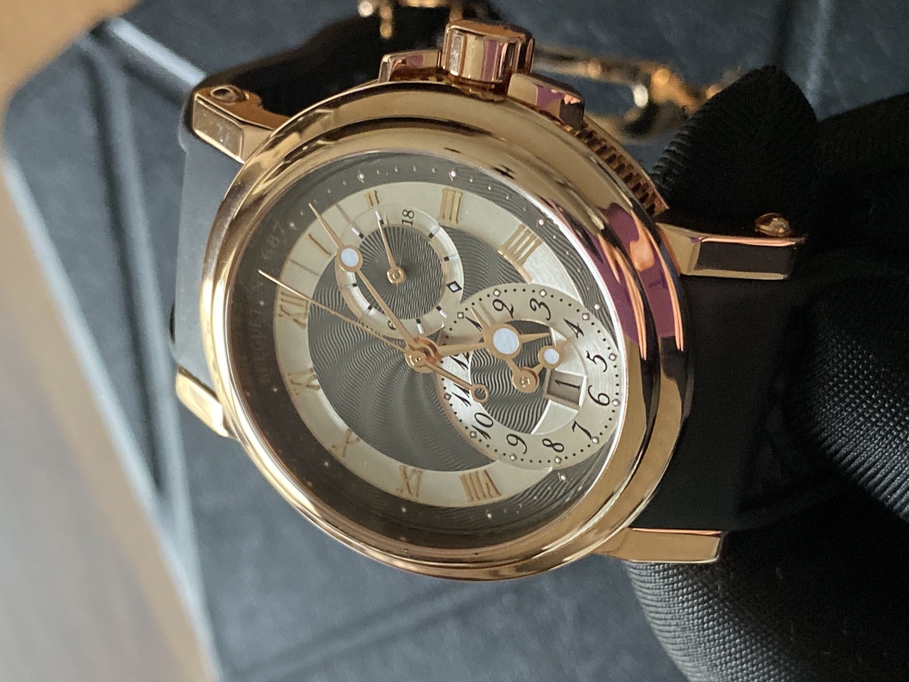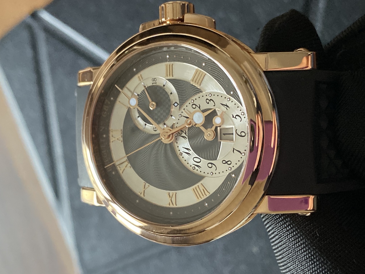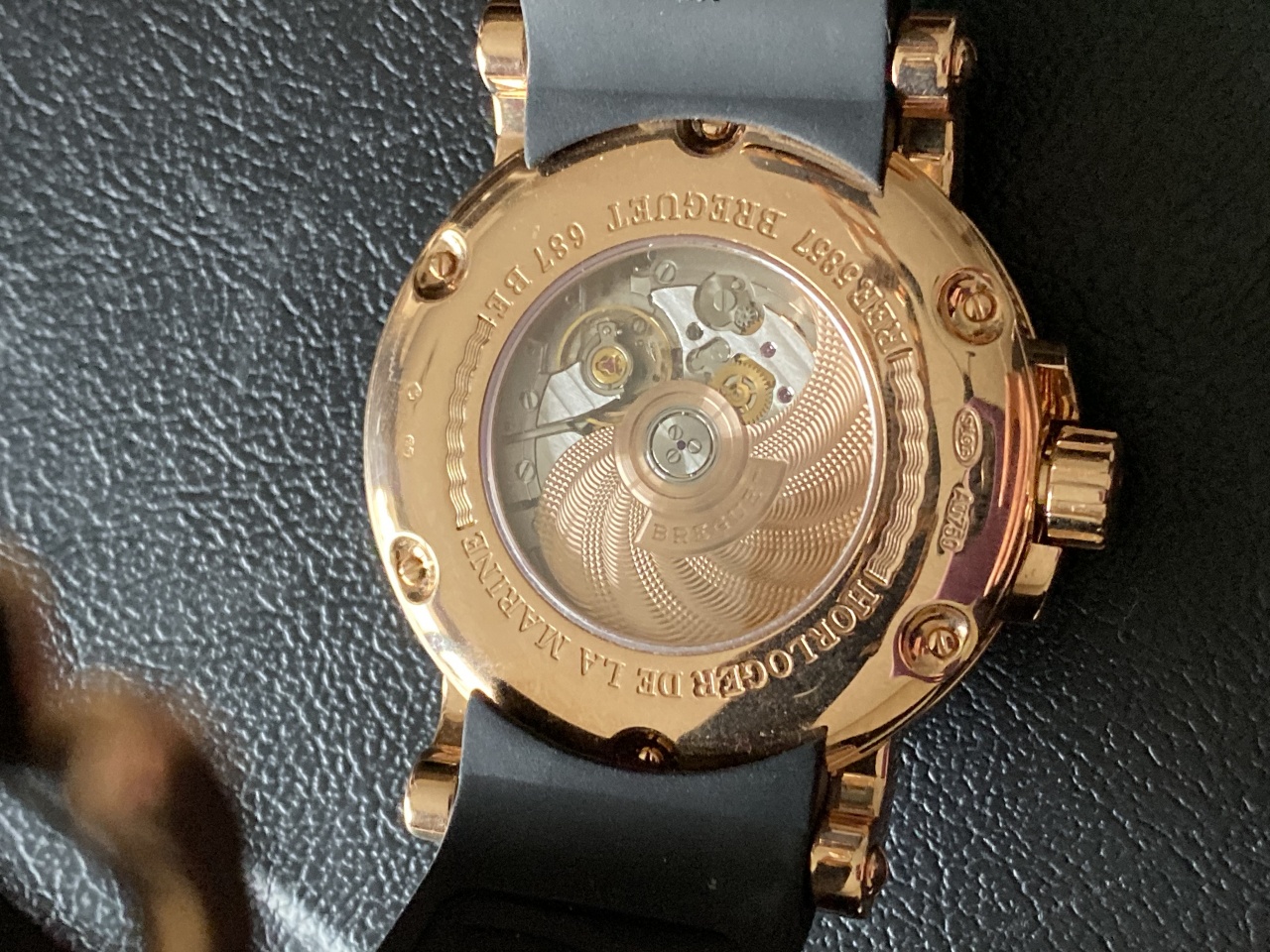 Уникальные, потрясающие мужские часы от Breguet коллекции Marine станут настоящим подарком для истинных поклонников классики и традиций, которые прошли сквозь десятилетия. Они гармонично дополнят образ своего обладателя и подчеркнут его индивидуальность и изысканный вкус. Эти часы не только выполняют лишь функцию определения текущего времени, но оснащены индикатором второго часового пояса. Для любителей функциональных аксессуаров это настоящий подарок. Часы выполнены в корпусе из розового золота 18 карат размером 42 мм. Толщина корпуса составляет 12,25 мм. Механический калибр с ручным автоподзаводом, который приводит в движение стрелки, собран лучшими мастерами. Часы предназначены для того, чтобы в них плавали и имеют водонепроницаемость 100 м. Циферблат закрыт прозрачным антибликовым стеклом из сапфирового хрусталя высокой прочности, благодаря чему обеспечивается максимальная защита от сколов и механических повреждений. Благодаря прозрачной задней крышке корпуса можно увидеть практически все детали превосходного механизма и получать эстетическое наслаждение, глядя на его слаженную работу. Ремешок, изготовленный из каучука с раскладывающейся застежкой из золота, выполнен в строгом стиле и воплощает элегантность. Запас хода до 72 часов. Задняя крышка прозрачная.