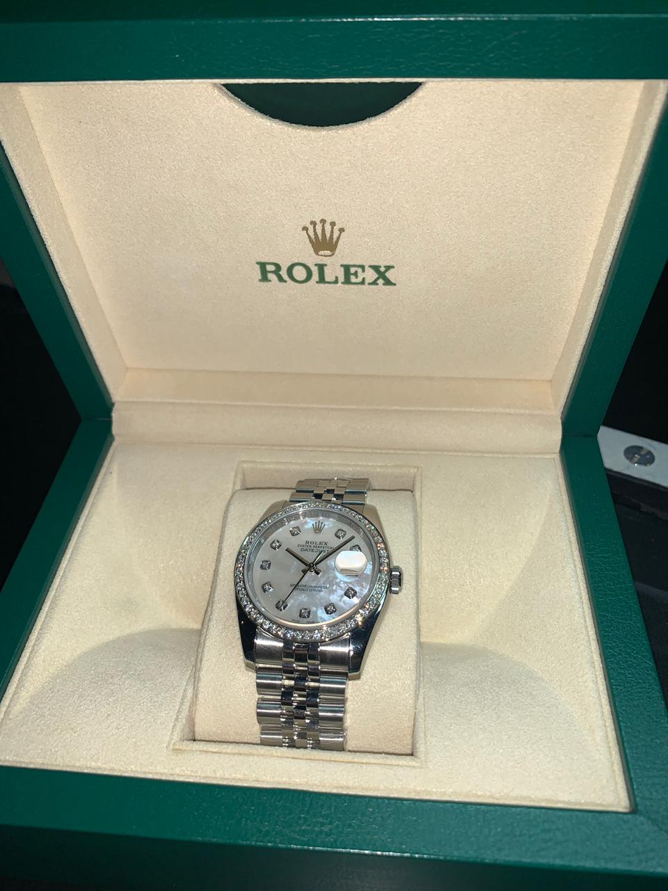 Сертифицированный хронометр COSC. Автоматический подзавод в двух направлениях с помощью ротора Perpetual. Калибр 3135, мануфактурного производства Rolex. Запас хода 48 часов. Водостойкость WR 100. Центральные часовая, минутная и секундная стрелки. Мгновенно устанавливаемая дата с возможностью быстрой корректировки. Возможность остановки секундной стрелки для выставления точного времени. Корпус выполнен из нержавеющей стали. Диаметр корпуса 36 мм. Устойчивое к возникновению царапин сапфировое стекло. Завинчивающаяся задняя крышка. Синяя парамагнитная спираль Parachrom. Привинчиваемая заводная головка с системой двойной герметизации Twinlock. Цифры 6, 9 и безель дополнительно украшены бриллиантами. Браслет Jubilee, пятирядные звенья, выполнен из нержавеющей стали. Скрытая застежка Crownclasp с раскладывающейся пряжкой. Любые проверки у дилера или сертифицированного часового центра.