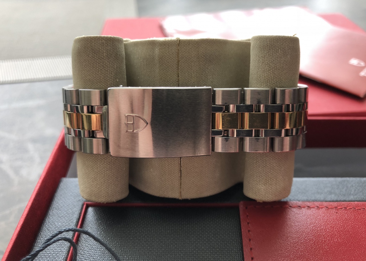 Браслет часов выполнен из стали 316L и золота 18K, безель и ЗГ золотые.