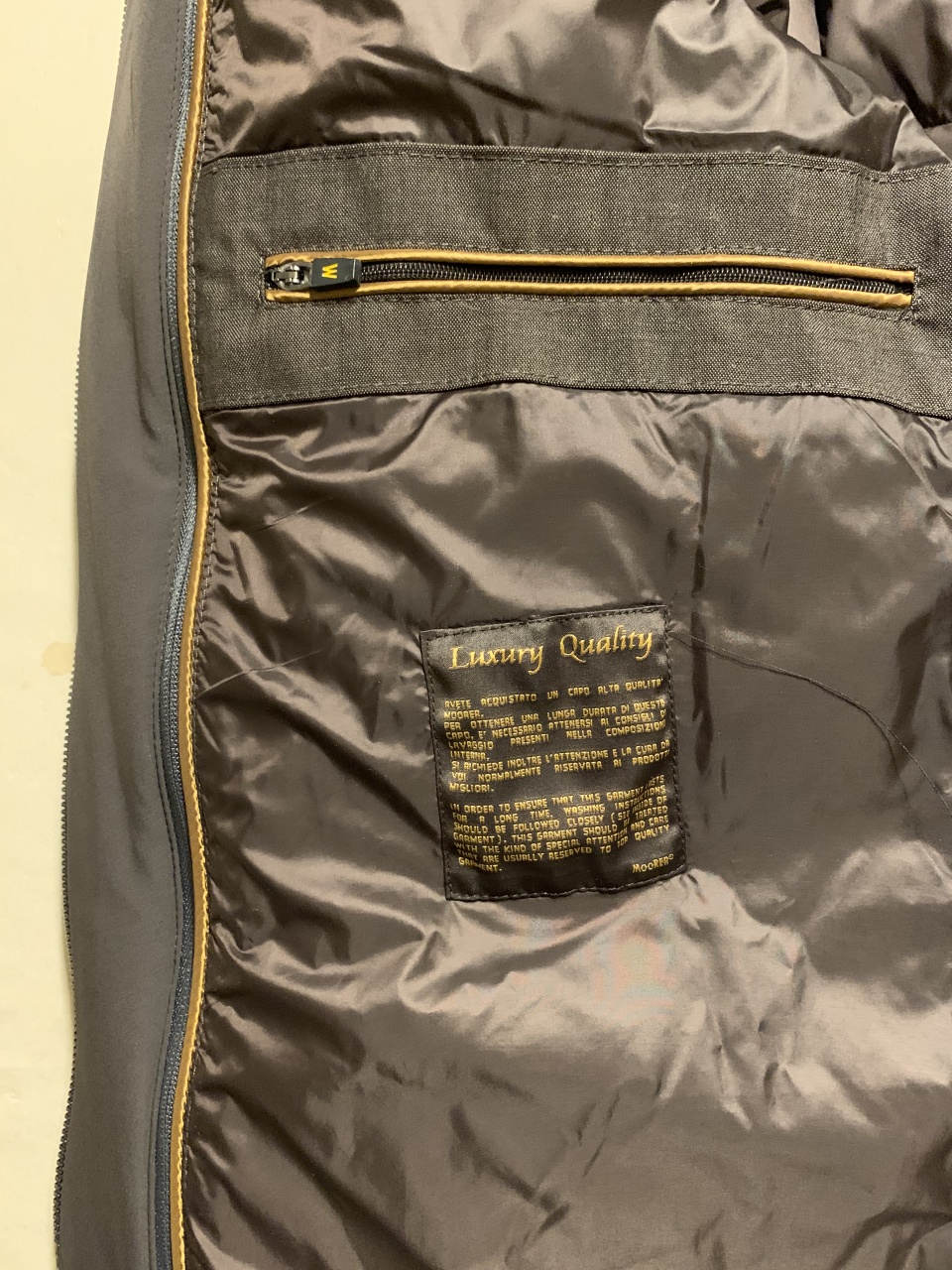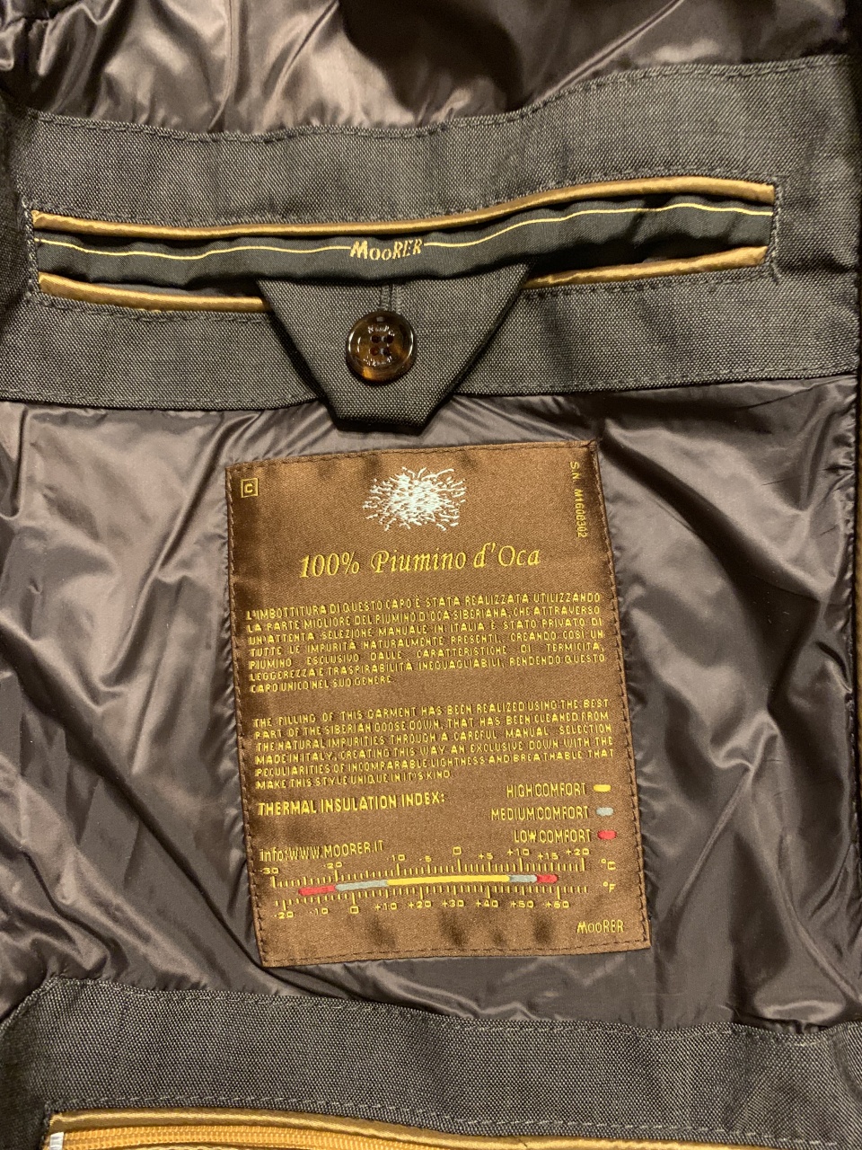 Продается новый мужской пуховик, стилизованный под пиджак, бренда MOORERпревосходного исполнения, цвета кофе с молоком, однобортная модель с лацканами, из водоотталкивающей ткани, ветрозащитная вставка на молнии, логотип, застегивается на пуговицы с логотипом бренда, два наружных кармана с клапанами, два внутренних кармана на молнии и пуговице с логотипом бренда, внутри пух, соответствующий евростандарту - соотношение пуха и пера 95/5, рассчитан на температуру до -26 градусов, состав: 88% полиамид, 12% полиуретан,, все бирки и запасная фурнитура прилагаются, гарантированный оригинал, размер 56(IT), производство Италия.