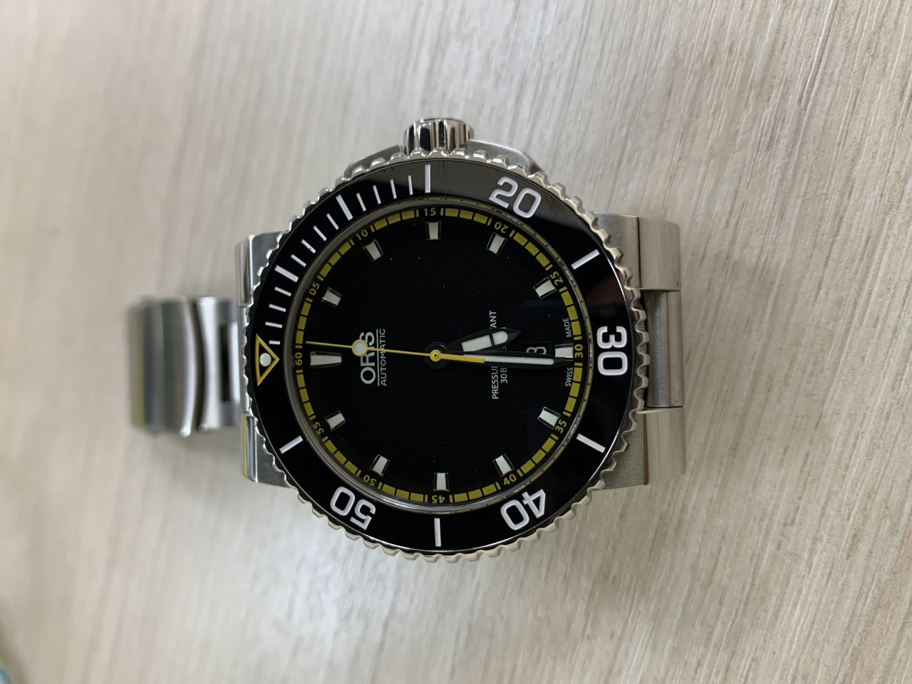 Oris ORIS AQUIS / КЕРАМИЧЕСКИЙ БЕЗЕЛЬ / ЧЕРНЫЙ ЦИФЕРБЛАТ / ЖЕЛТАЯ ОКАНТОВКА / БРАСЛЕТ / 43 ММ