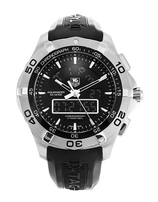 Механизм: Кварцевый хронограф: * Аналоговый дисплей с расположенными по центру часовой, минутной и секундной стрелками; * Цифровой дисплей с подсвечивающимся циферблатом; * Хронограф c точностью измерения до 1/100 секунды; * Обратный отсчет времени с таймером; * Функция напоминаний; * Вечный календарь; * Второй часовой пояс. Стекло: устойчивое к царапинам сапфировое стекло с антибликовым покрытием с обеих сторон. Корпус: корпус из матовой стали с полированными краями. Диаметр: 43 мм. Циферблат: черный циферблат со спиралевидным узором в центральной зоне и тремя окошками для отображения нескольких функций. Полированные стрелки, наложенные вручную цифры, часовые метки с люминесцентным покрытием. Наложенный вручную одноцветный фирменный знак TAG Heuer. Коронка: коронка из полированной стали с кнопкой для подсветки циферблата; простой поворот коронки обеспечивает доступ к 7 цифровым функциям. Задняя крышка: завинчивающаяся задняя крышка с выгравированным узором в виде аквалангиста. Безель: Уникальный двойной безель, состоящий из фиксированного кольца и вращающегося в одну сторону безеля из матовой стали с полированными выступами и минутной шкалой:* Выгравированные цифры, покрытые черным лаком, на вращающемся основании; * Точка с люминесцентным покрытием в положении «12 часов». Ремешок: Каучук, застежка бакля из стали; Герметичность: 300м.