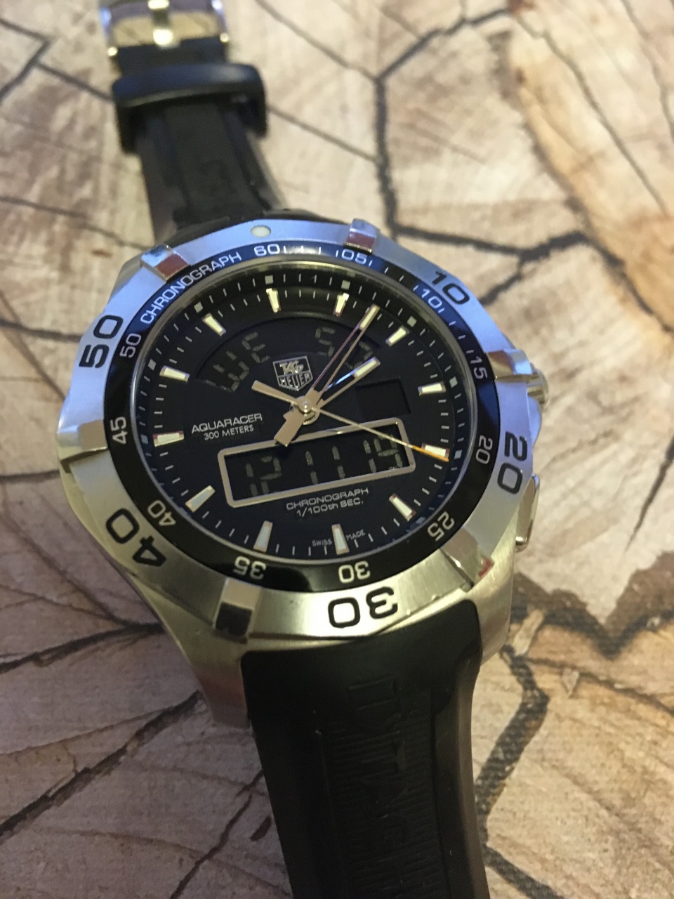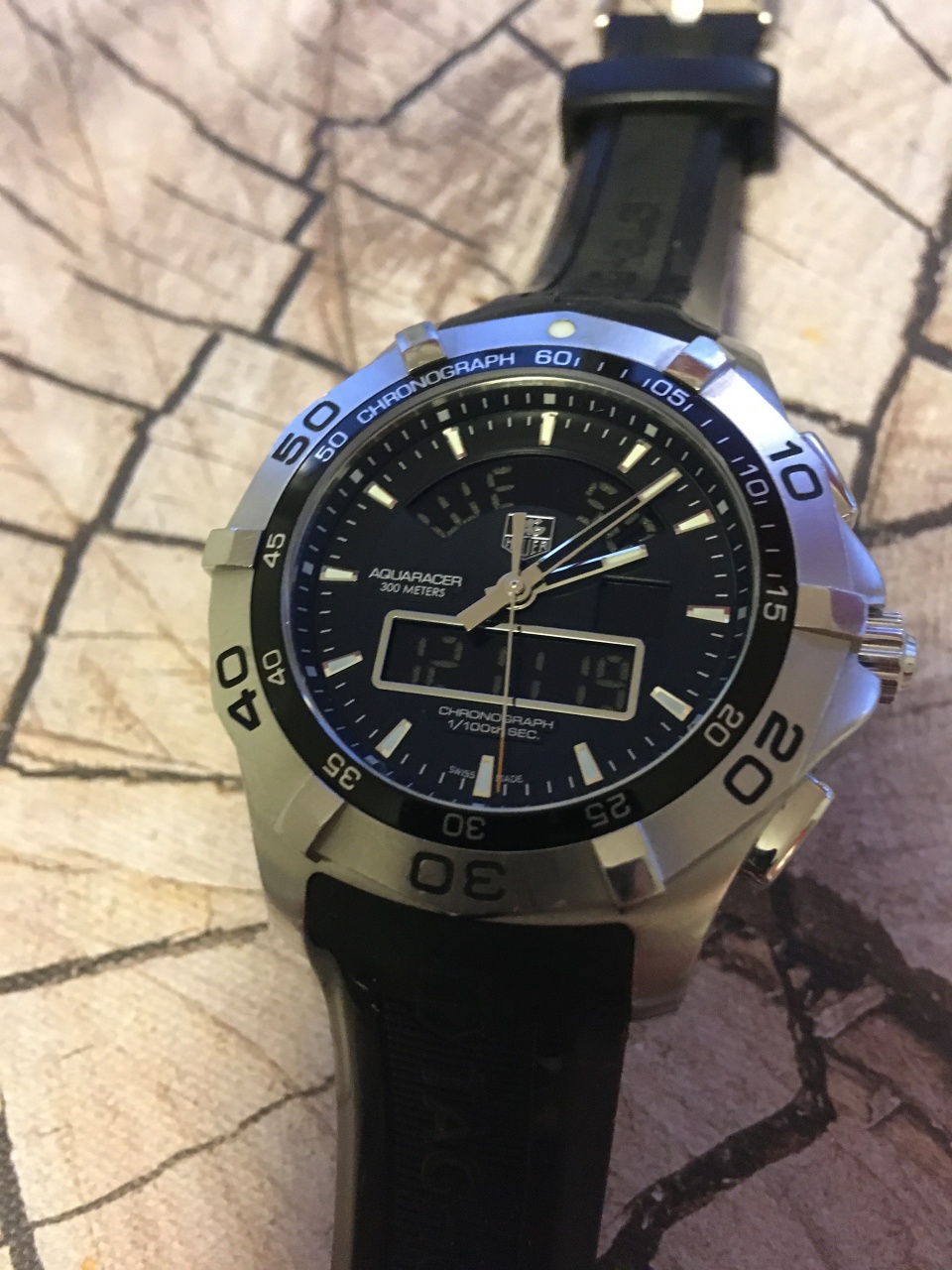 В продаже TAG HEUER - Aquaracer Chronotimer CAF1010.FT8011 в хорошем состоянии. На корпусе присутствуют естественные следы эксплуатации в виде паутинки, ничего критичного.