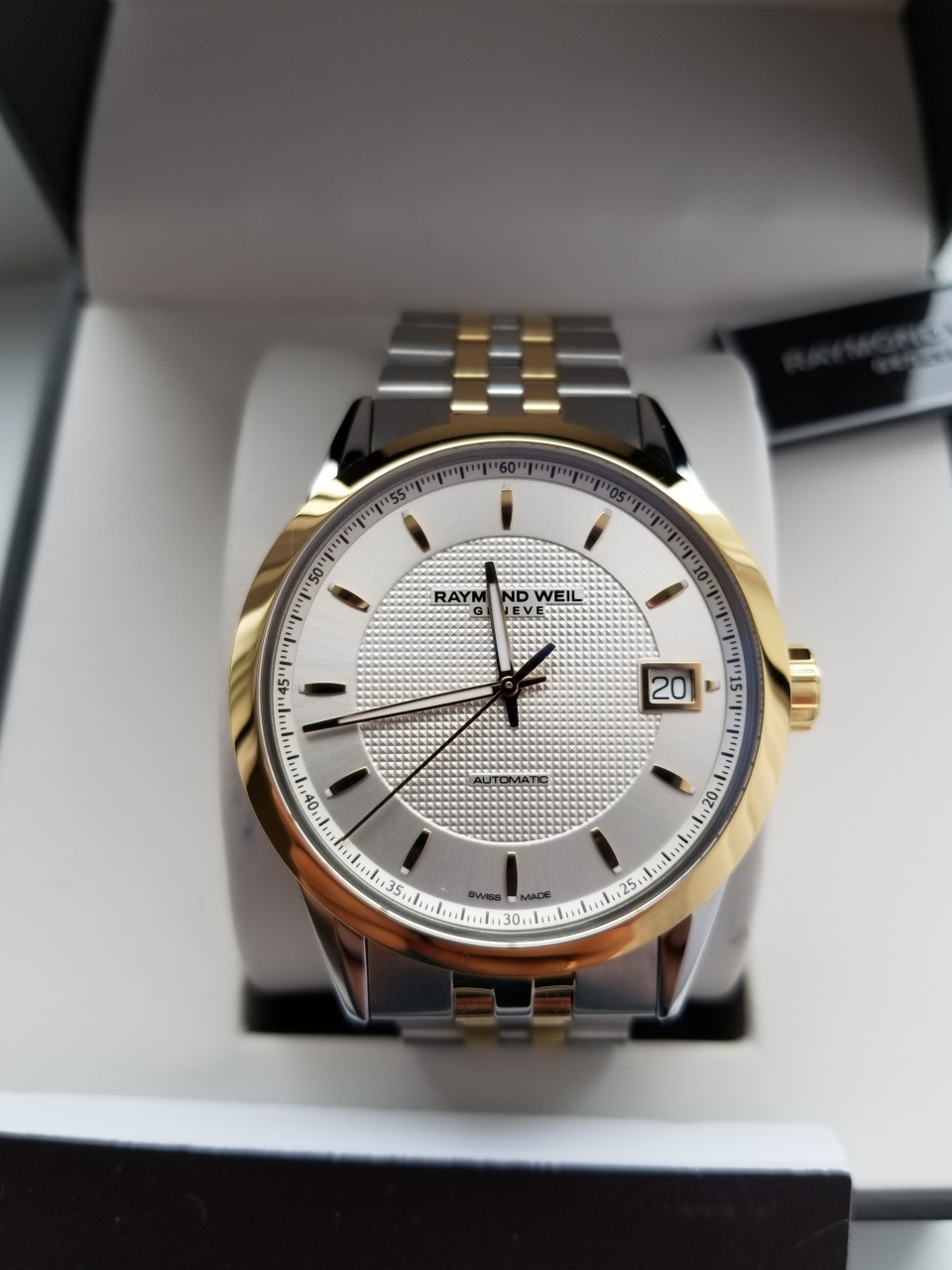 НЕВЕРОЯТНО СТИЛЬНЫЕ МУЖСКИЕ RAYMOND WEIL FREELANCER / D-43 /ВОДОЗАЩИТА 100 M / СВЕТЛЫЙ ЦИФЕРБЛАТ / БРАСЛЕТ / БЕЛОЕ И ЖЕЛТОЕ ЗОЛОТО / ПОЛИРОВАННАЯ И САТИНИРОВАННАЯ СТАЛЬ - Часовой форум Watch.ru