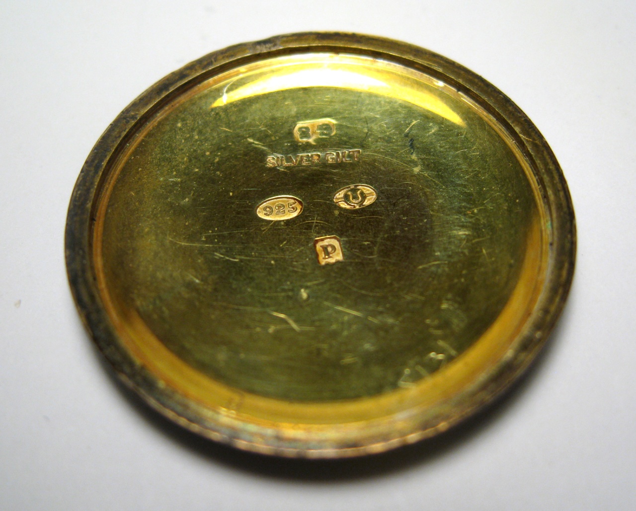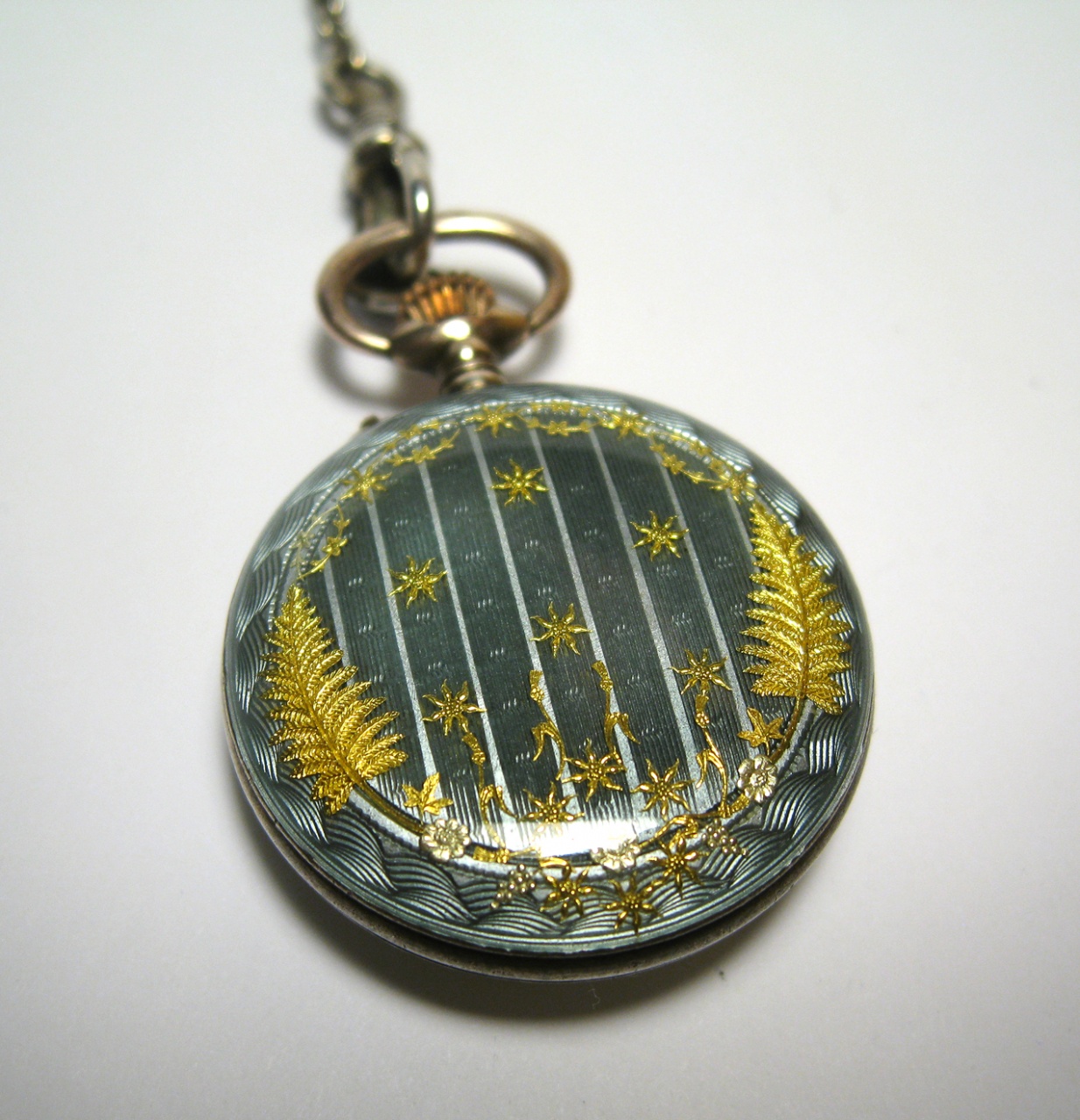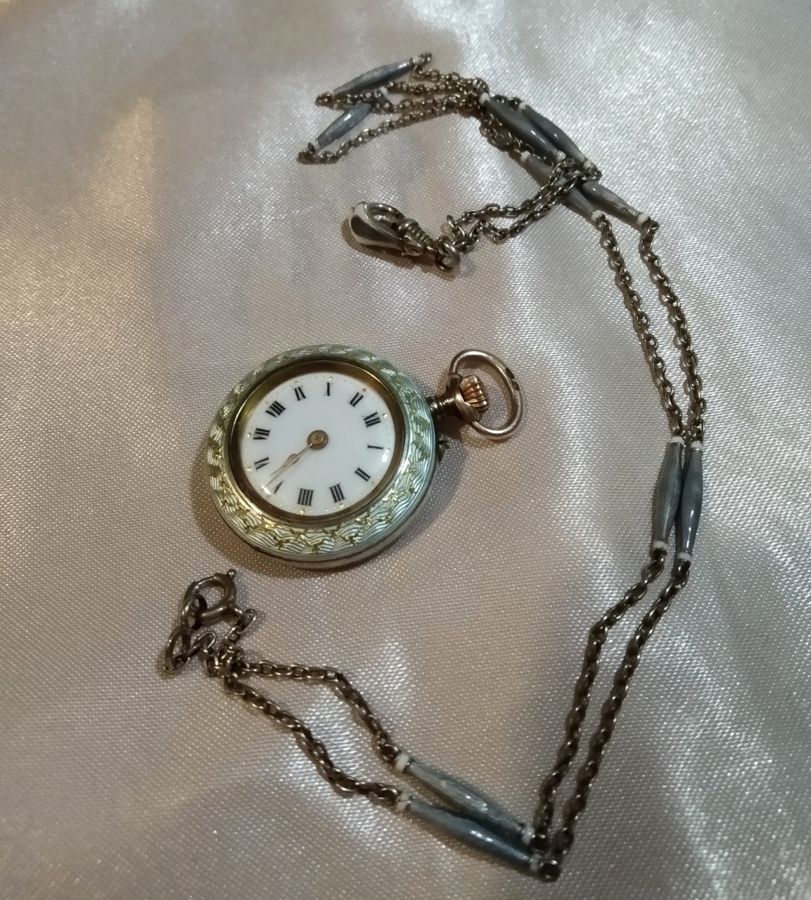 Корпус и цепочка выполнены из серебра 925 пробы (все пробы и клейма присутствуют). Гильошированный корпус украшен эмалью с позолотой, на цепочке также есть элементы с эмалью (см. фото). Диаметр корпуса — 25 мм, вес 20,75 г., длина цепочки — 60 см, вес 8,35 г.