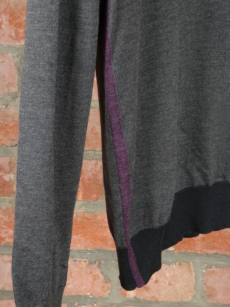 Приятная деталь дизайна - пуловер сбоку дополнен полосой фиолетового цвета, что добавляет стильный цветной акцент, не нарушая общий классический образ модели.