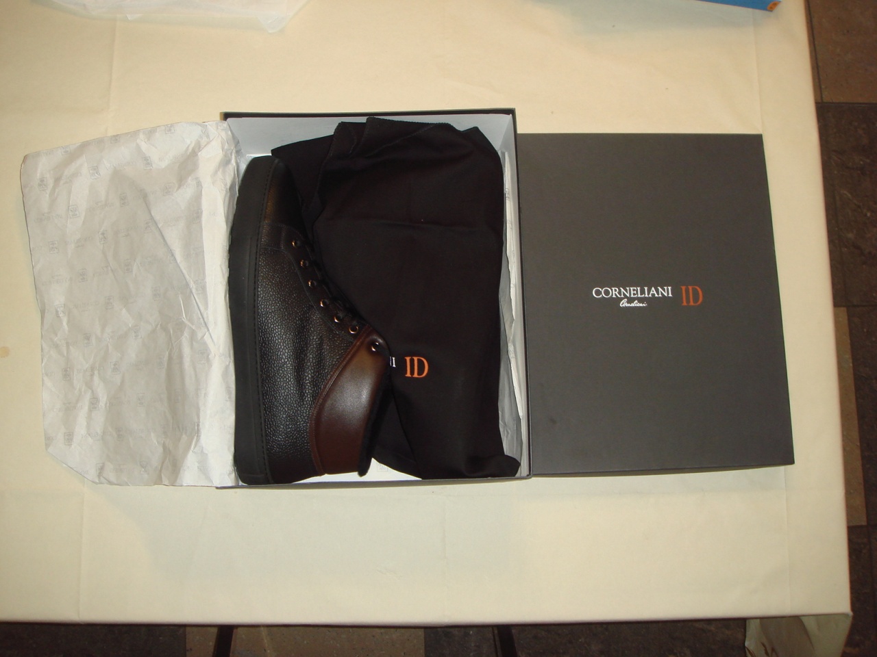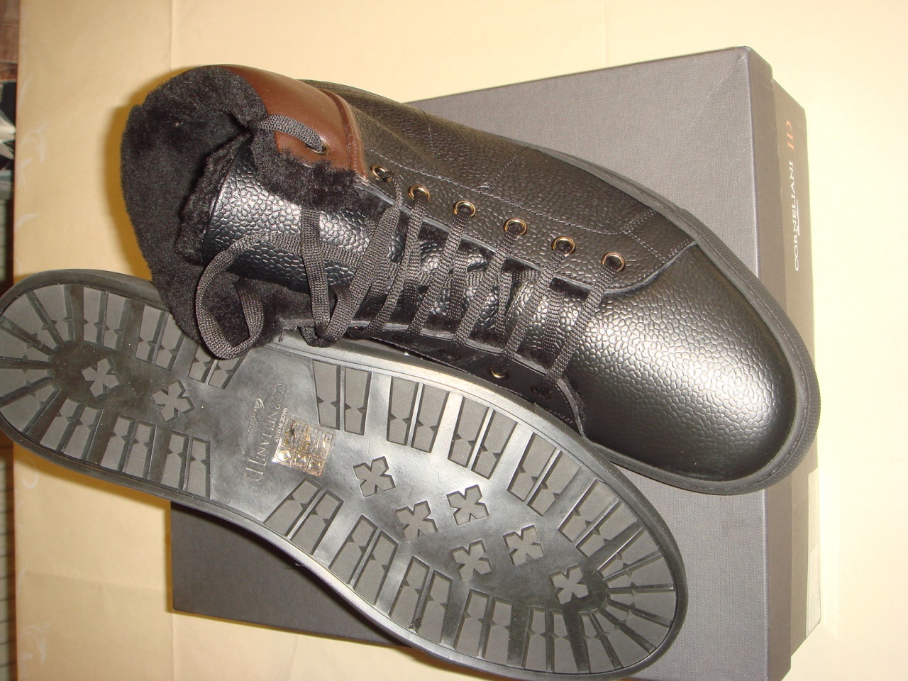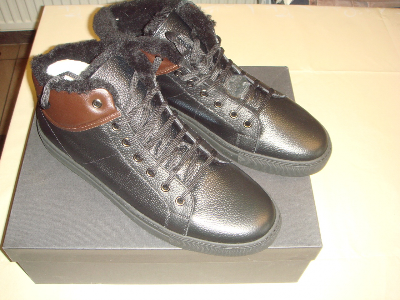 Продаются новые мужские сникерсы на натуральном меху бренда CORNELIANI ID превосходного исполнения, черного цвета со вставками коричневого цвета, высококачественная кожа, скругленный мысок, внутри 100% натуральный мех, резиновая подошва Extralight, гарантированный 100% оригинал, размер 10 (44) ,производство Италия.