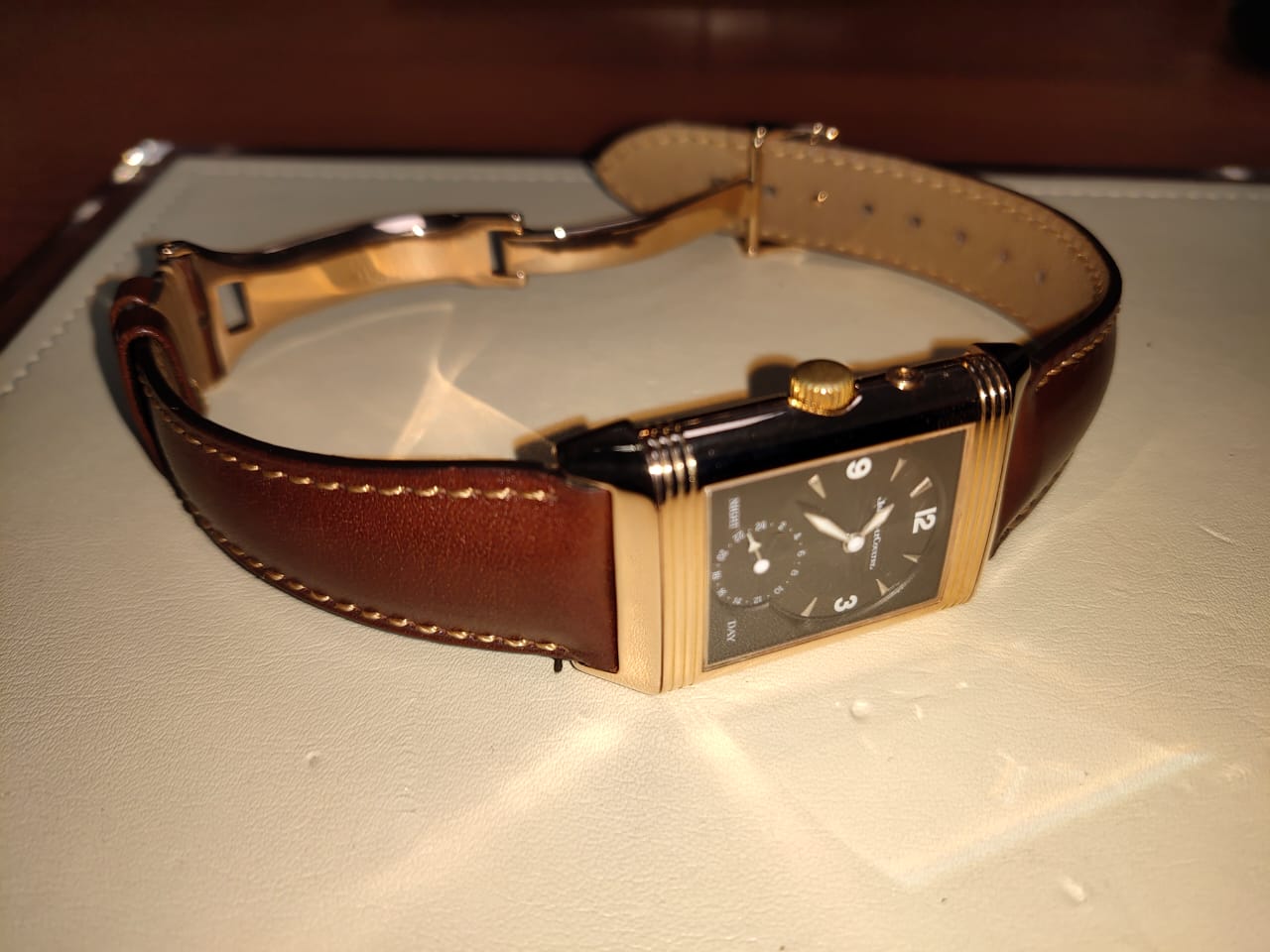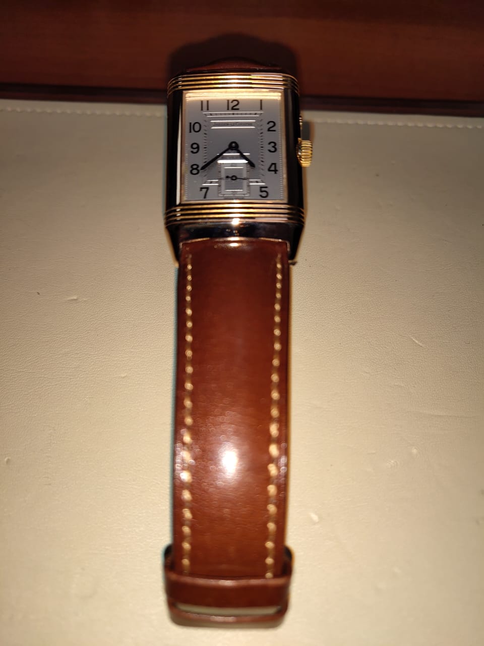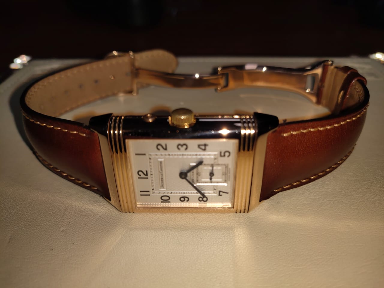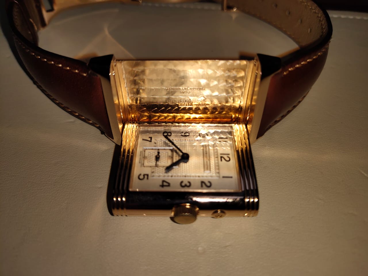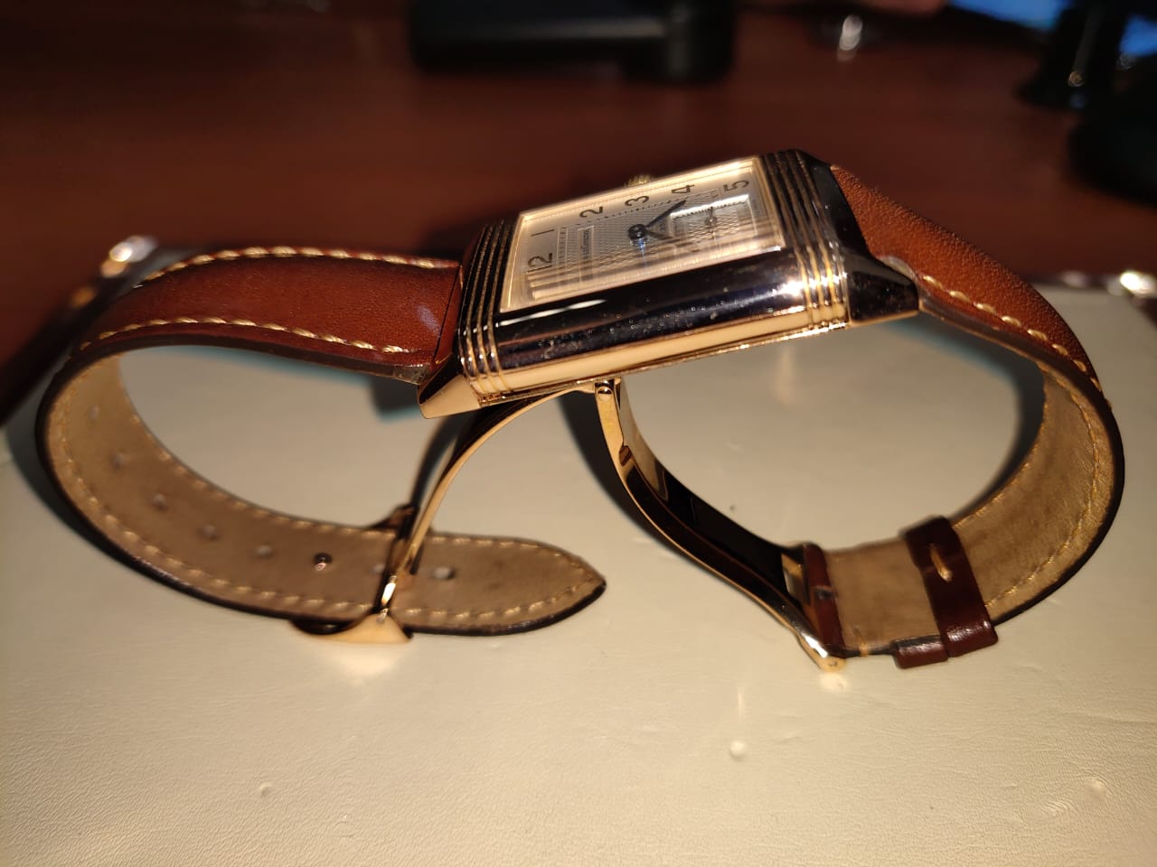 Престижнейшие мужские золотые двусторонние часы Jaeger LeCoultre Reverso в корпусе с двумя циферблатами, быстро меняющимися путем простого переворота в зависимости от настроения владельца. Механизм ультра тонкий с ручным заводом. Ref. 270.2.54 Размер часов 28x46 мм. Идеальное состояние. Полировка не делалась и не требуется. Часы некрупные, но выглядят на руке потрясающе. Застежка сложная раскладная из золота 750 пробы. Ремень новый Hirsh очень качественный коричневого цвета, идеально подходящий для этой модели.