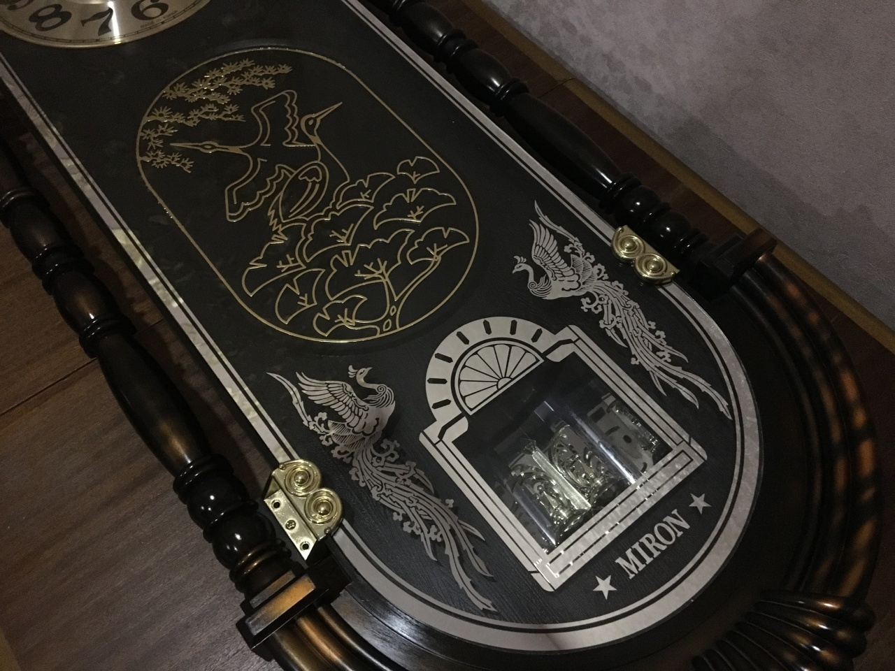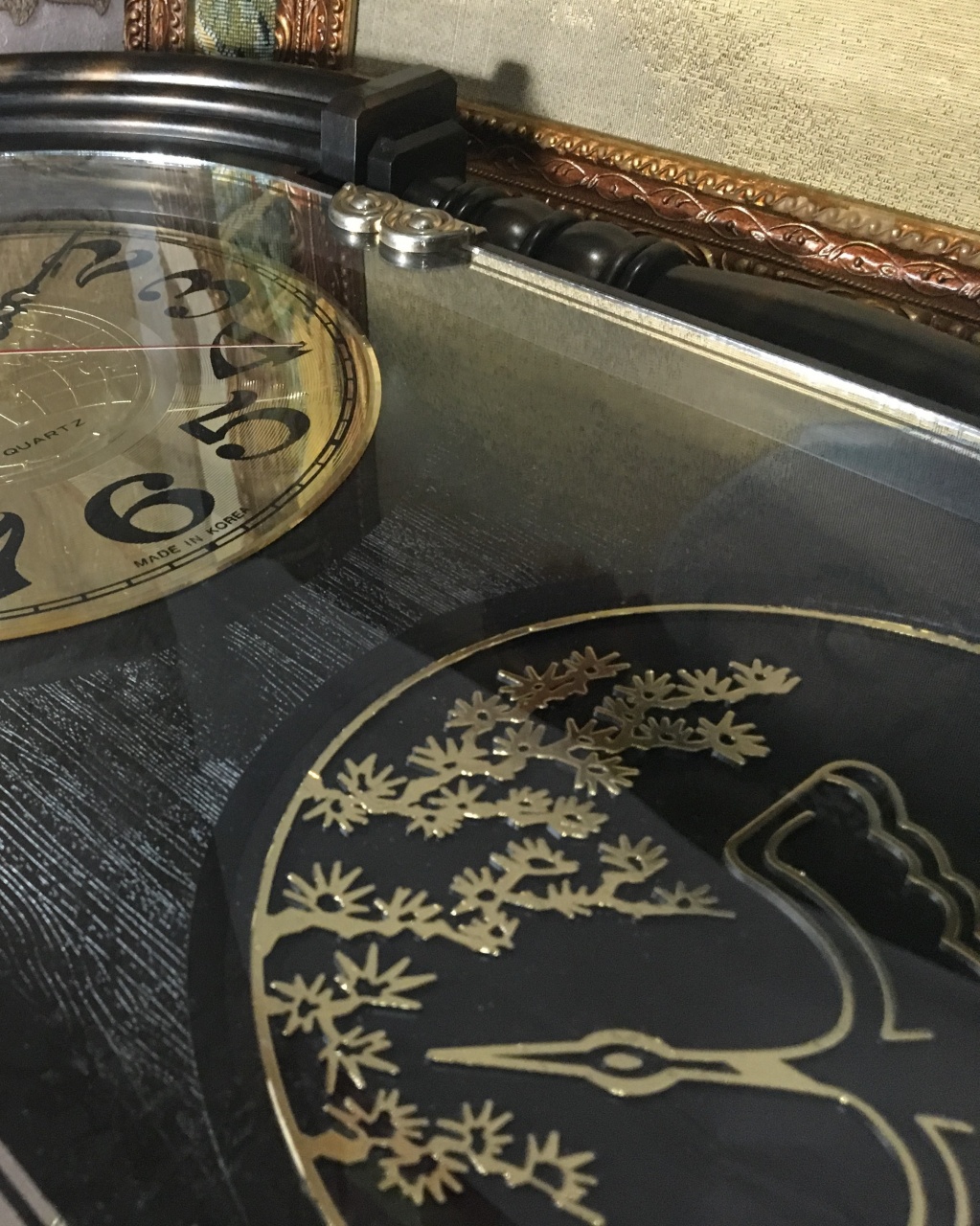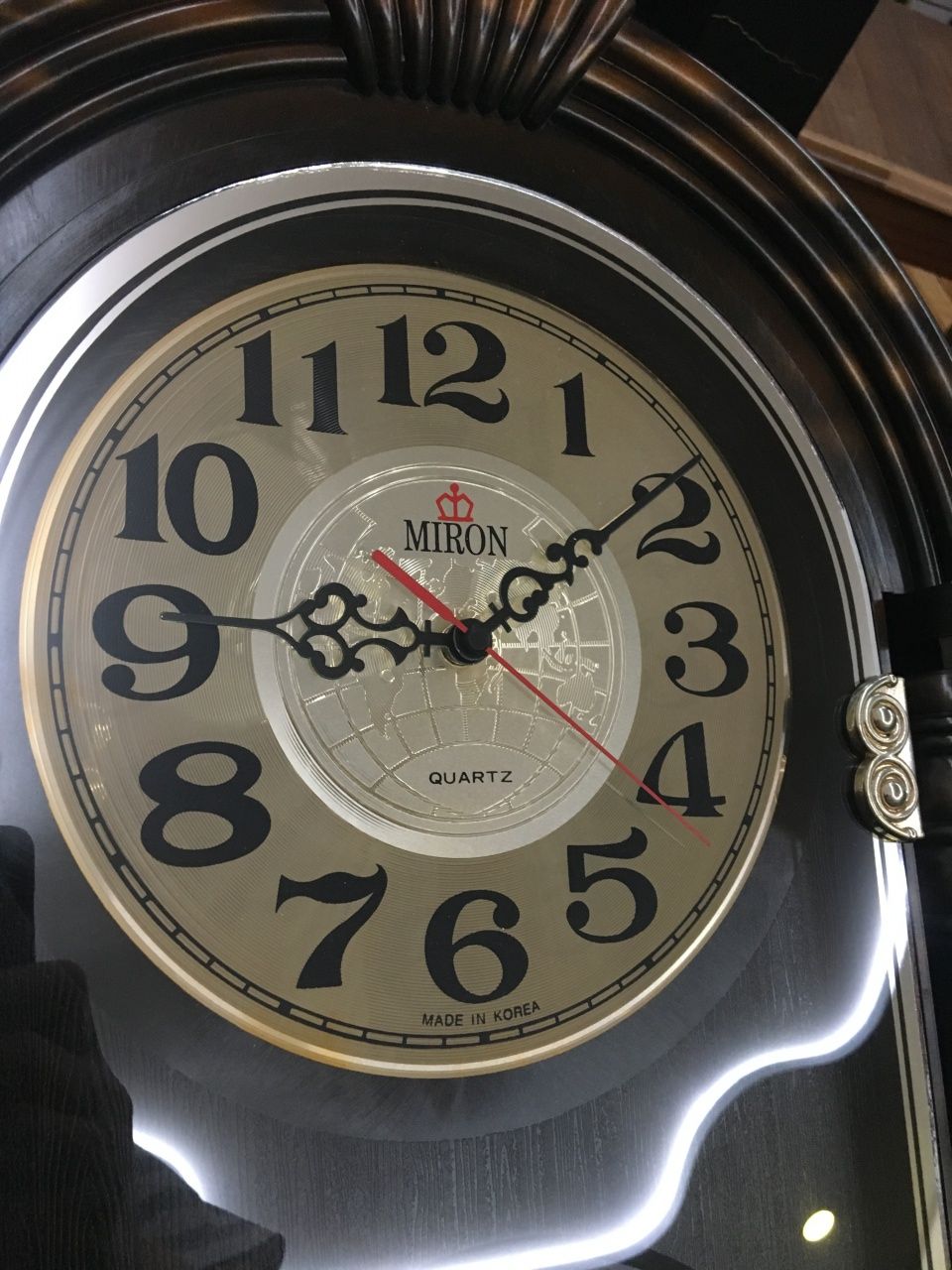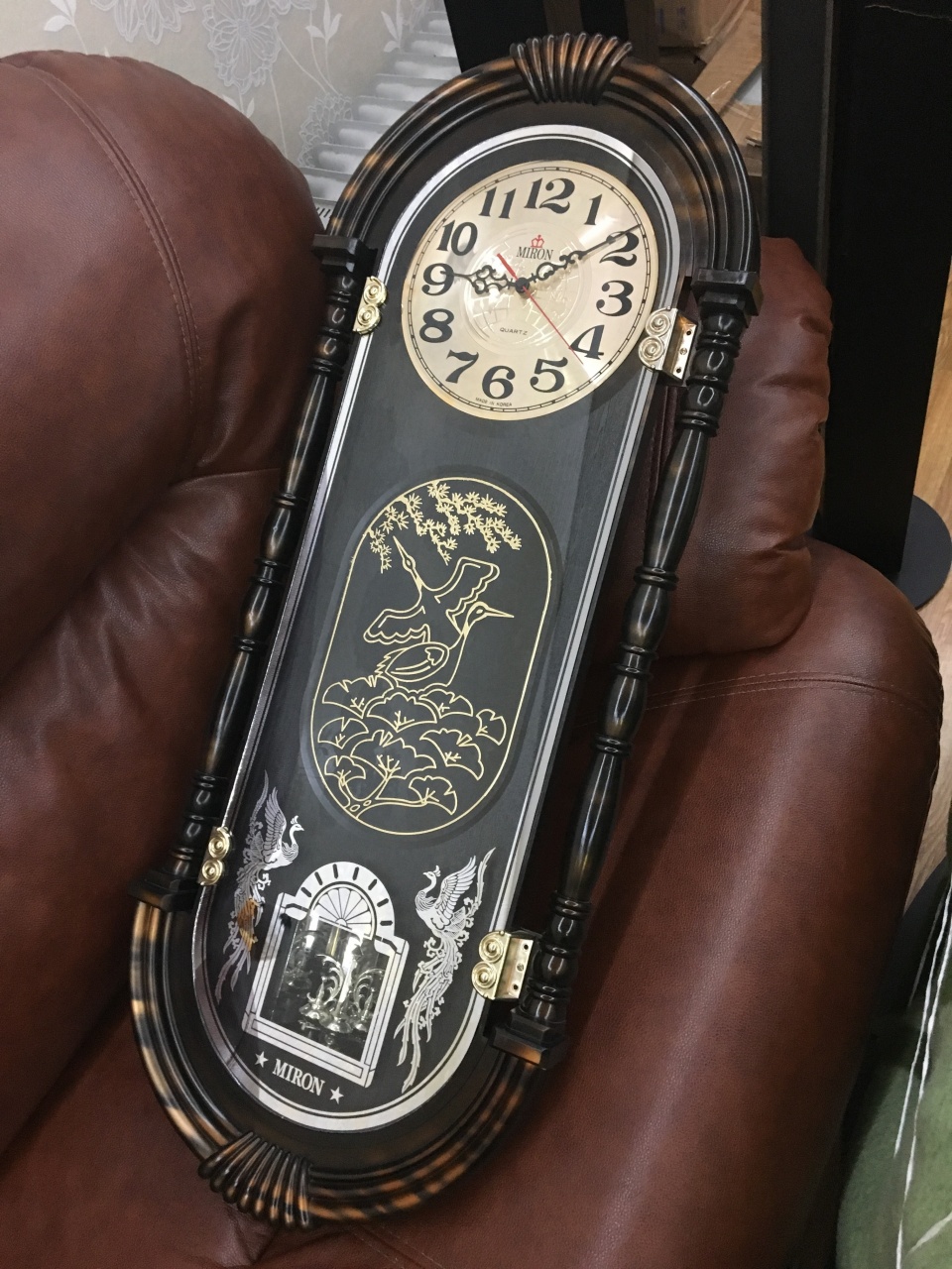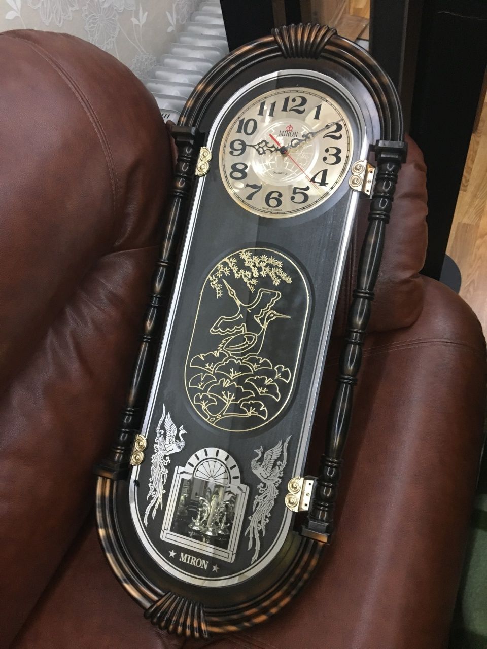 В продаже интерьерные, с мебельным декором, настенные кварцевые часы - работа от элемента питания. На лицевой стороне - СТЕКЛО - не пластик! Корпус - пластик. Интересное решение переливающегося циферблата и мебельного декора под стеклом в зависимости от освещения и угла просмотра. Надпись на циферблате MADE IN KOREA. Часы имеют два механизма - один для измерения времени, второй (в нижней части корпуса) для вертушки маятника. Так вот эта вертушка