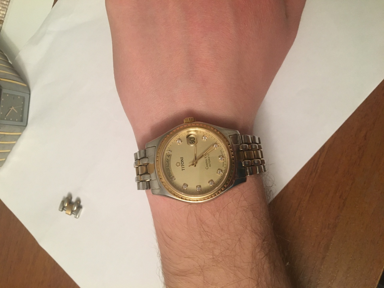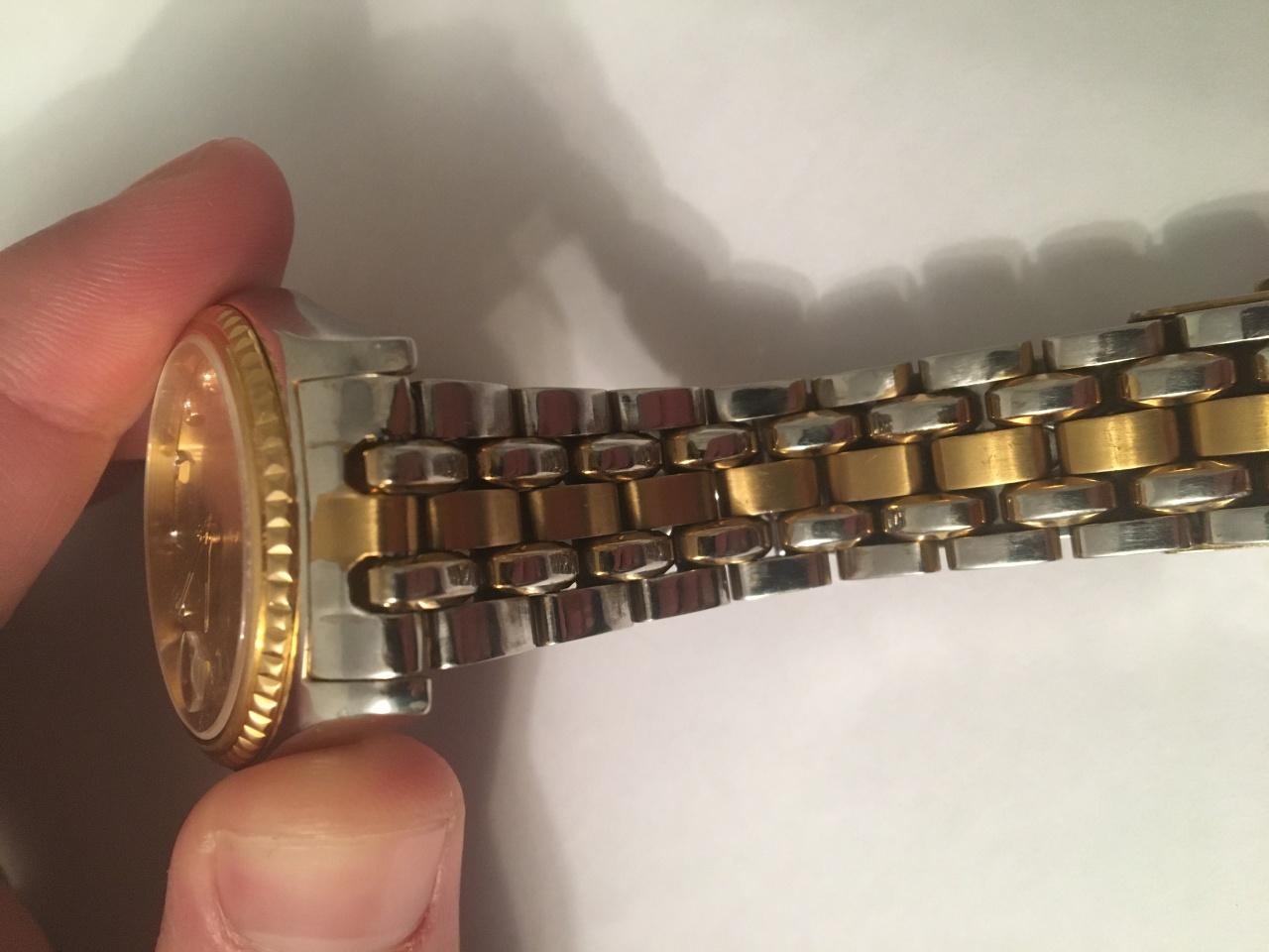 ГЛАВНЫЙ НЮАНС!!!-часы были полностью в позолоте, от времени позолота начала слезать по углам, и часы были отданы ювелиру, где была сполирована вся позолота. Позолота осталась только на безеле, ЗГ и средней части браслета, а также с внутренней стороны. Естественно, геометрия корпуса пострадала, потому и цена практически за внутренности. Однако выглядят вполне ничего.