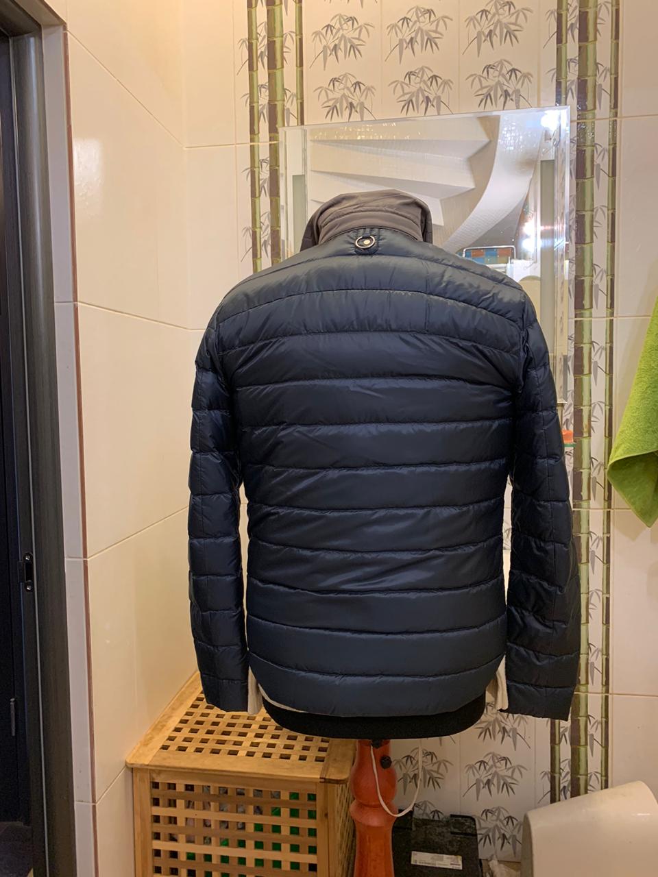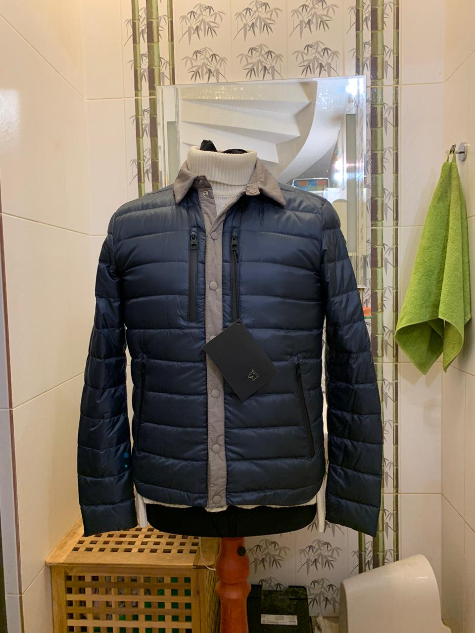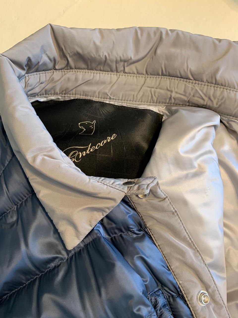 Продается новый мужской пуховик на переходный период бренда MONTECORE превосходного исполнения, стеганый узор, логотип, темно-синего цвета, классический воротник, воротник и передняя планка контрастного бежевого цвета, однобортная модель, кнопки, множество карманов, боковые прорезные карманы на молнии, на груди два кармана на молнии, внутри два кармана: на молнии и пуговице, внутри на гусином пуху, длина 70 см, состав: 100% полиамид, все бирки и запасная фурнитура прилагаются, гарантированный оригинал, размер 52(IT), страна бренда Италия.