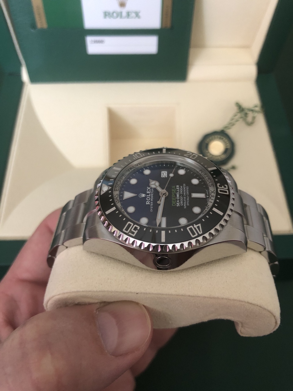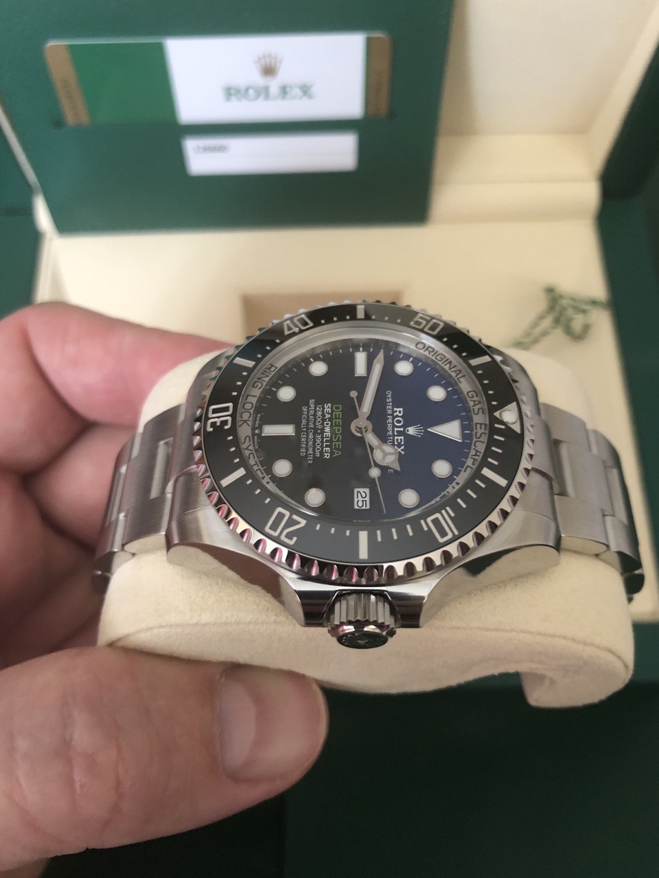 Новая версия знаменитой модели часов Rolex Sea-Dweller Deepsea! Референс данной модели Ролекс 126660. Часы выполнены из нержавеющей стали, цвет циферблата переходит из темно-синего в ярко-насыщенный черный. Данный циферблат был выпущен в 2014 году для специальной памятной версии в честь экспедиции Deepsea Challenge, организованной при поддержке Rolex и Национального географического общества. В ходе этой экспедиции кинорежиссер и исследователь Джеймс Кэмерон достиг самой глубокой точки Мирового океана – дна Марианской впадины, глубина которой составляет 10 908 метров.