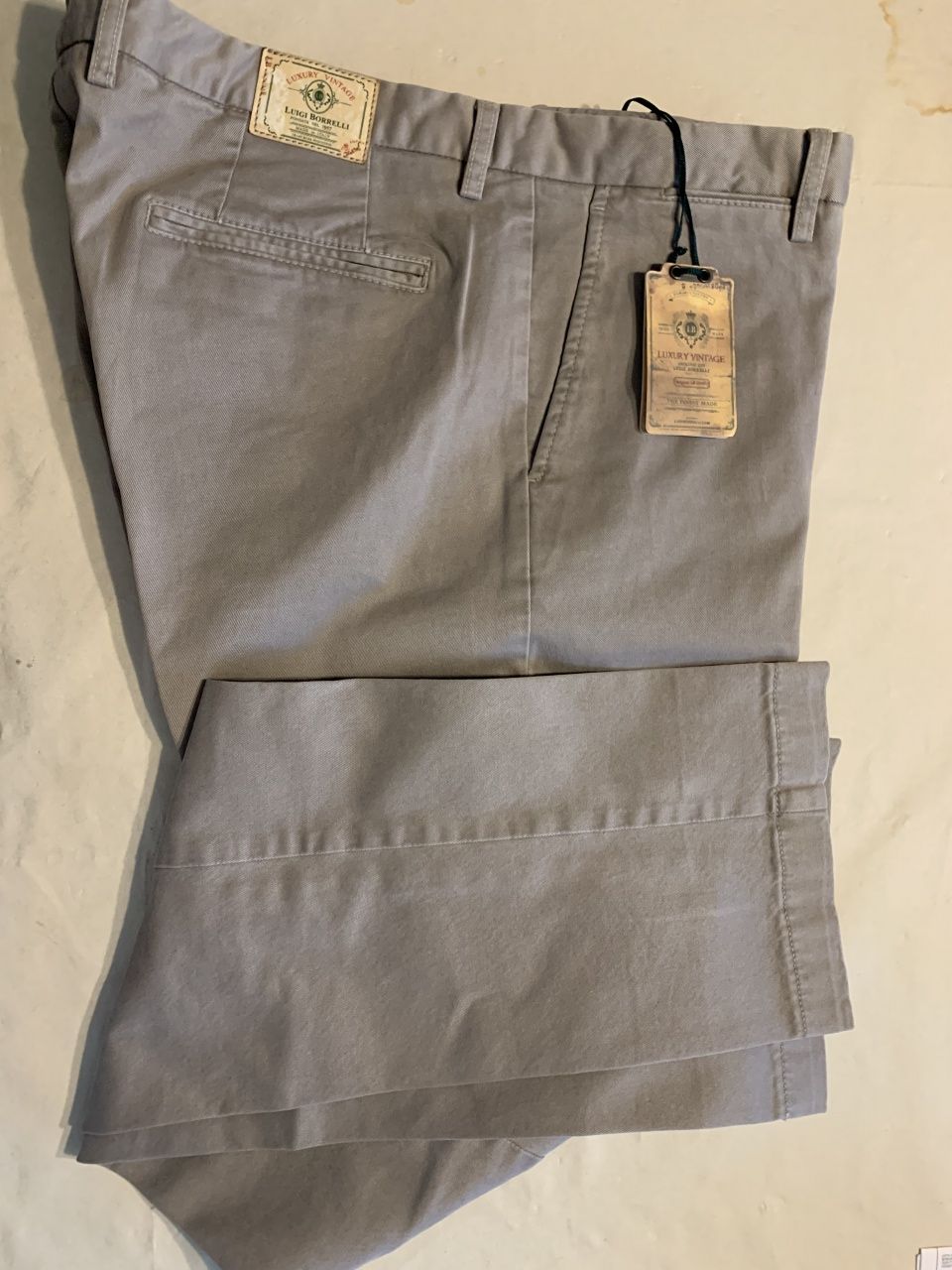 Продаются новые мужские брюки бренда де люкс LUIGI BORRELLI превосходного исполнения LUXURY VINTAGE, габардин, серого цвета, логотип, застежка спереди, молния и пуговицы, множество карманов, прямой крой брюк, состав: 100% хлопок, все бирки и запасная фурнитура прилагаются , гарантированный оригинал, размер 56(IT) , производство Италия