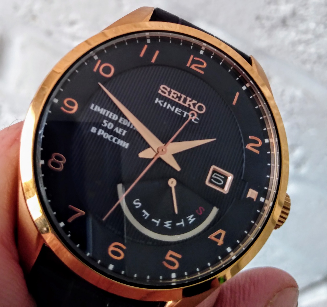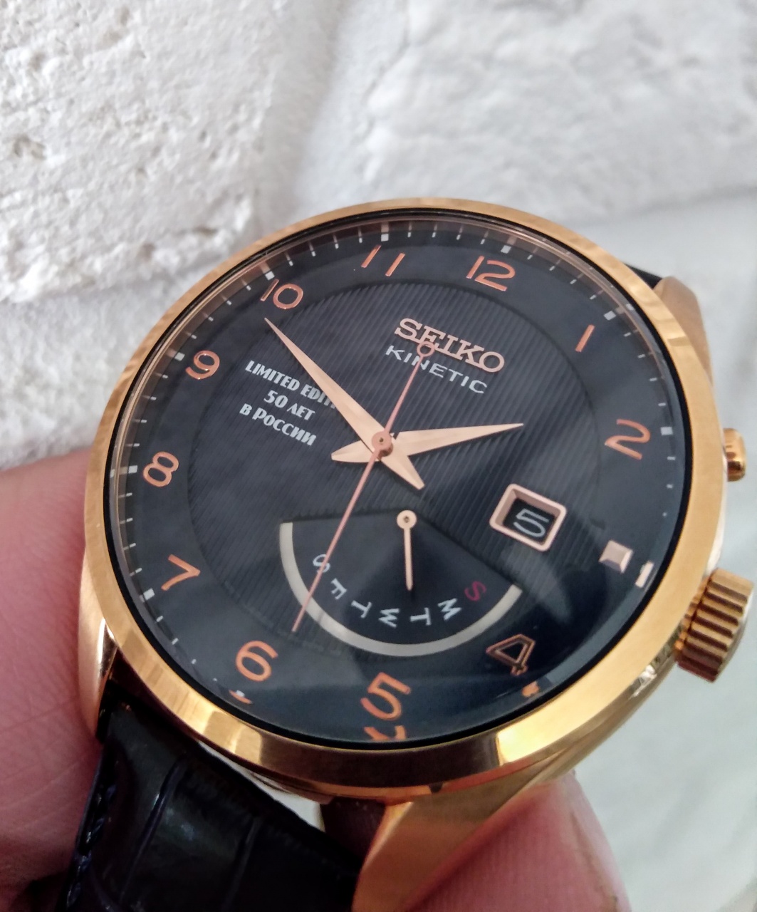 Продаю в полном комплекте редкие лимитированные (555 шт) Сейко, посвященные пятидесятилетию деятельности компании в России. О чем соответствующая надпись на циферблате и прозрачной задней крышке. Текст на Русском!. Часы б.у. , но скорее "музейного хранения", хозяин иногда выгуливал и заботился о состоянии аккумулятора калибра, выполненного с применением инновационной фирменной системы Кинетик. Диаметр 42мм, ремешок из теленка с тиснением под крокодила. Рvd "розовое золото", красивый насыщенно синий циферблат