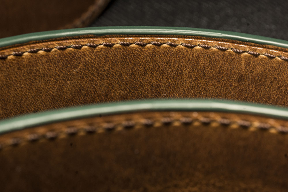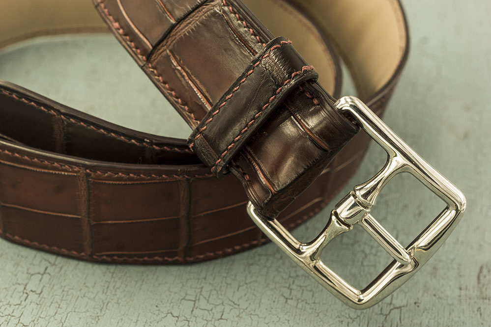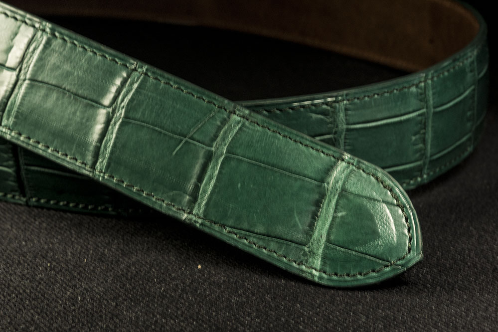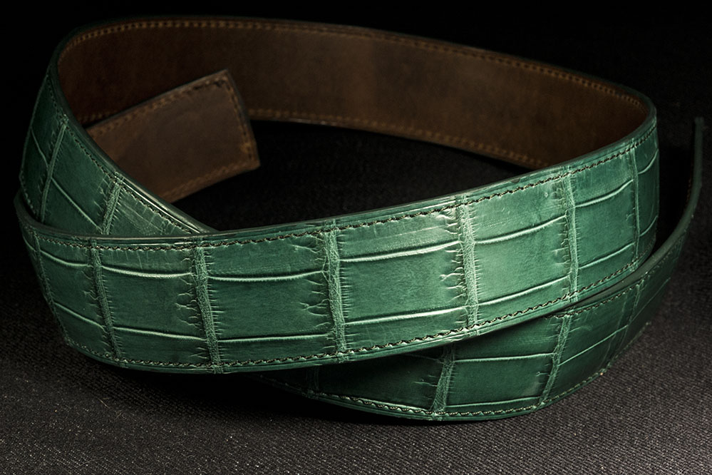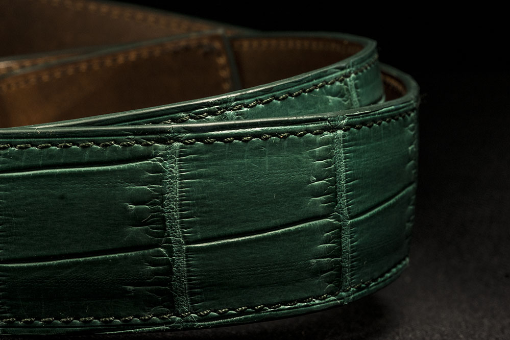 Ремень сделан всего из двух слоев кожи – крокодила и ременной полосы, профиль которой сформирован по дуге для придания подушкообразной формы. Толщина ремня у торцов 3мм, в центре 5мм. Отверстия будут пробиты под покупателя.