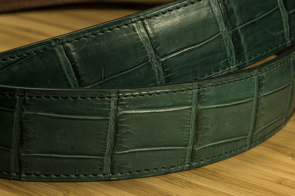 Ремень из крокодила классического зеленого цвета идеально подойдет для джинсов и другой неформальной одежды.