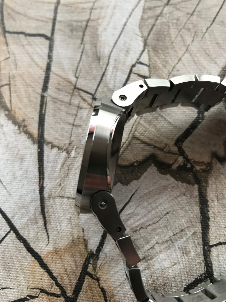 Браслет: Многокомпанентный из нержавеющей стали (на запястье до 18см!), раскладывающаяся застежка клипса с боковой кнопкой. Циферблат: Черный циферблат с нанесением структуры углеволокна, цифры и окошко даты синего цвета, накладные метки.