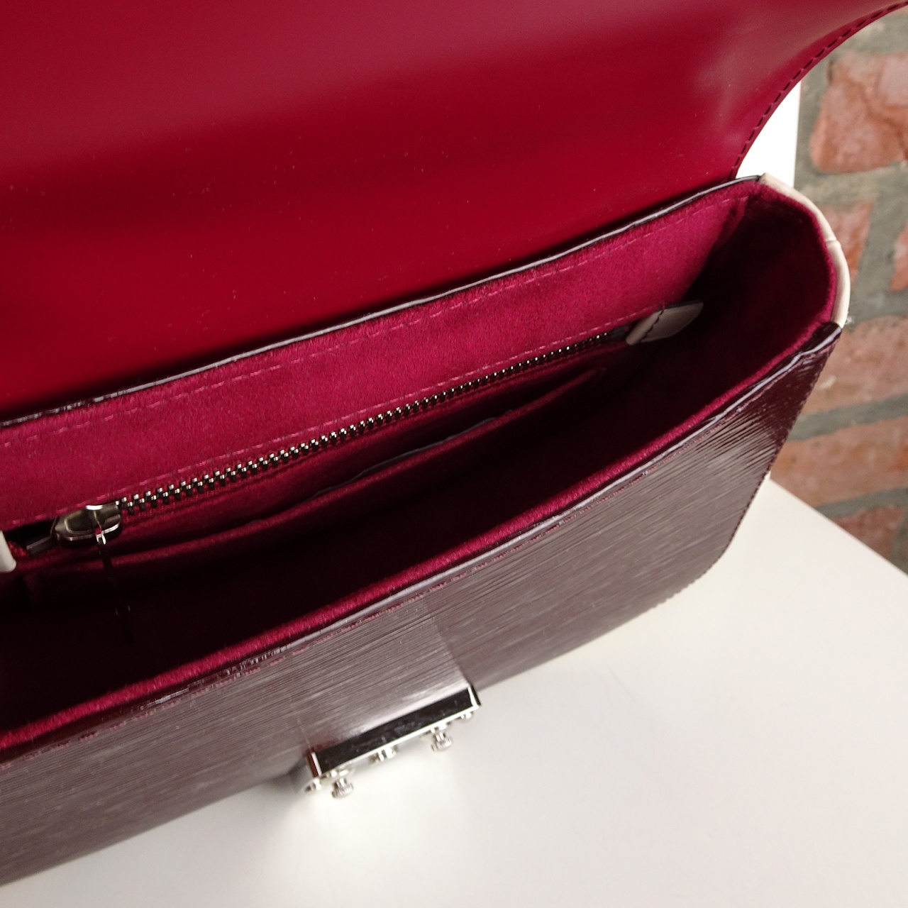 Внутри одно отделение, карман и карман на молнии. Интерьер из бархатистой алькантры бордового цвета.