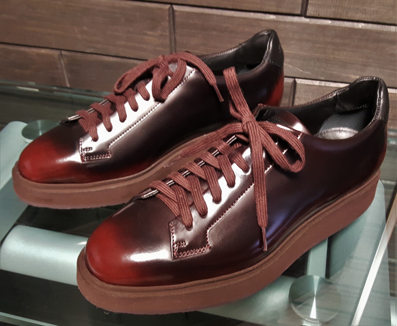Изготовлены из 100% гладкой телячьей кожи высочайшего качества выделки, окрашенной полностью вручную в тёмно-бордовый цвет («спелая вишня») с градиентным переходом цвета.