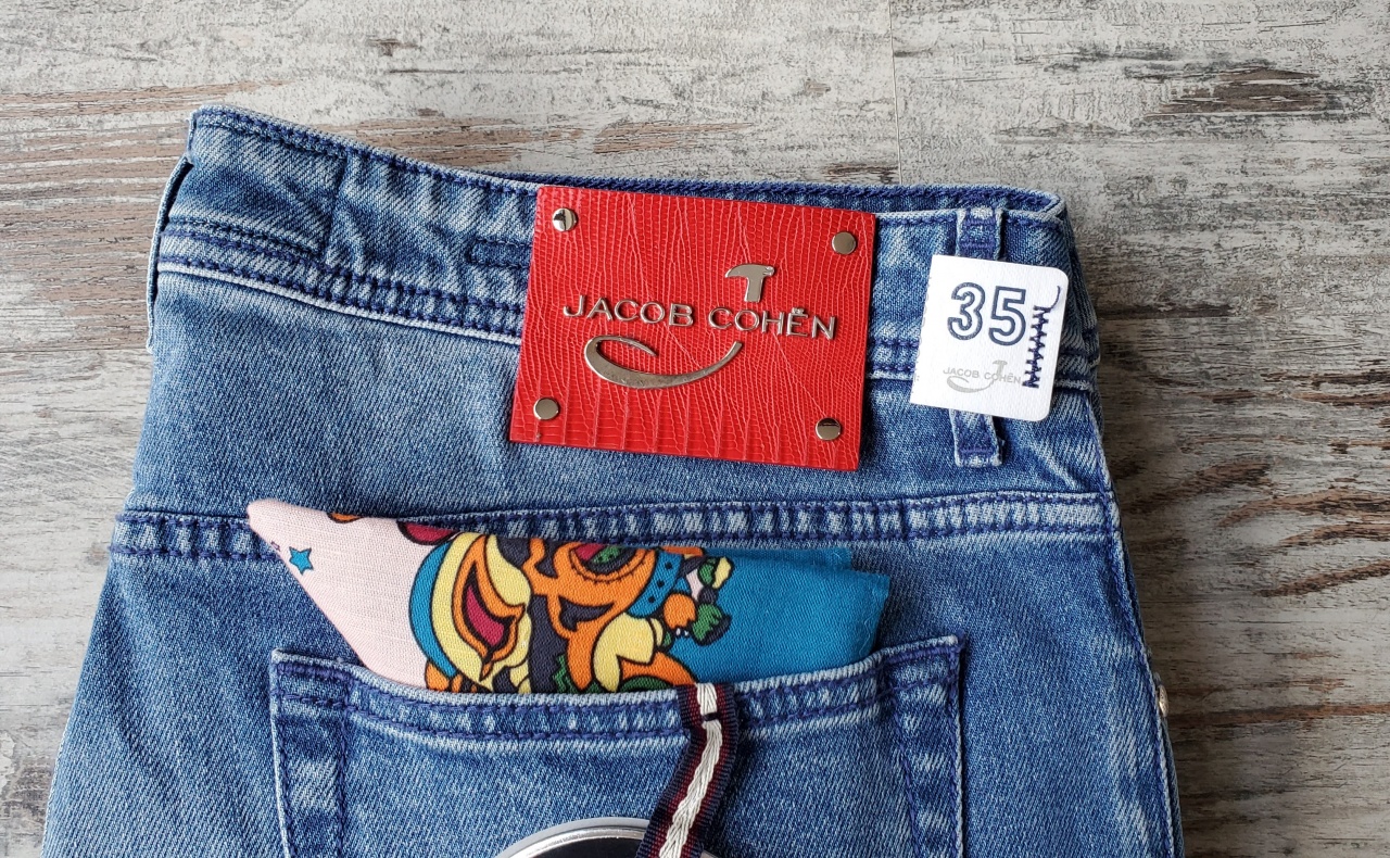 Сзади на правом бедре джинсы имеют фирменный ярлык из натуральной кожи игуаны красного цвета с логотипом из серебра марки Jасоb Соhеn.