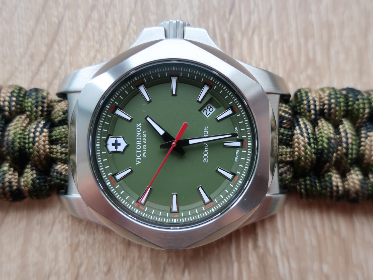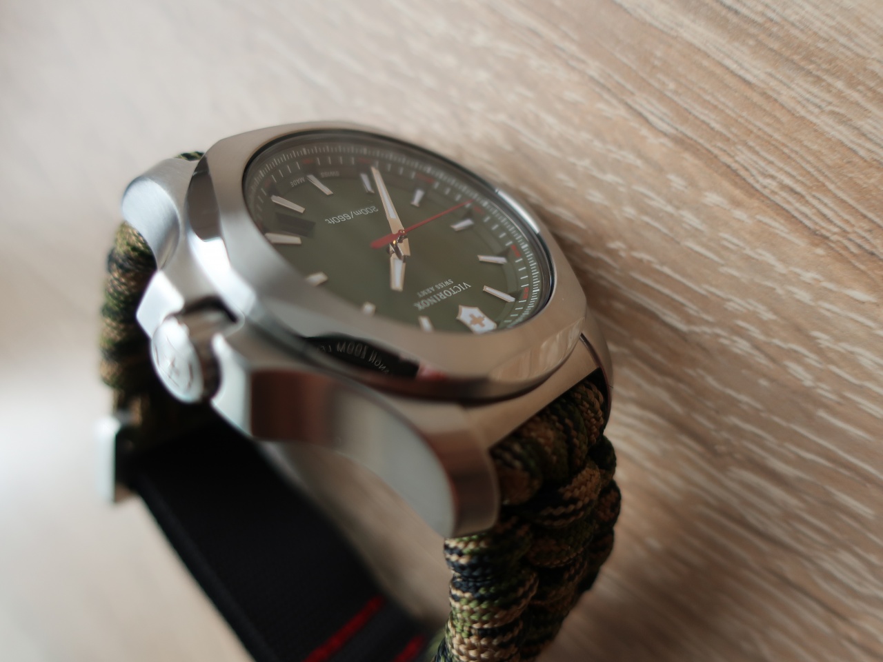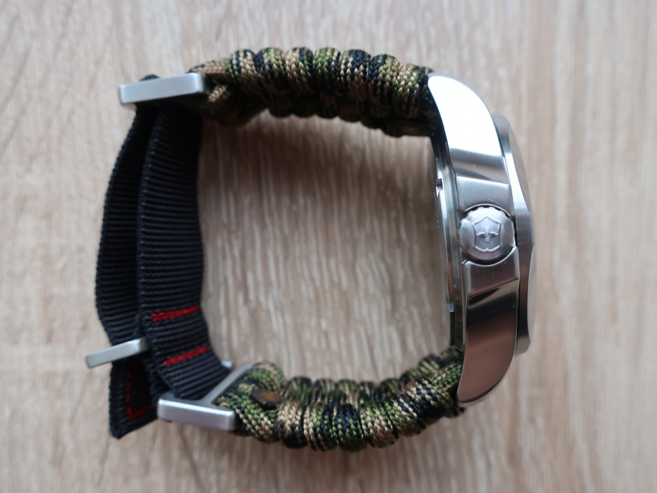 Мужские швейцарские наручные часы Victorinox Swiss Army 241727.1, коллекция I.N.O.X. Paracord. Swiss Made. Швейцарский кварцевый механизм Ronda 715 с функцией индикации заряда (EOL), дополнительно усиленный. Индикация даты. Усиленный стальной корпус диаметром 43 мм, завинчивающаяся заводная головка с максимальной защитой, монолитный циферблат цвета хаки, выточенные индексы, люминесцентное покрытие стрелок и индексов, утолщенное сапфировое стекло 2,3 мм с тройным антибликовым покрытием, водонепроницаемость до 200 м. Скошенный шестиугольный безель. Уникальный спасательный браслет Naimakka из паракорда. Нейлоновая стропа Naimakka используется в армии США в парашютах для спуска тяжелой армейской техники, 1 стропа выдерживает нагрузку в 250 кг. В случае необходимости браслет можно расплести и получить 2,5 м стропы Naimakka, которую можно использовать множеством способов: поставить палатку, перекинуть груз, зашнуровать обувь, отбуксировать лодку, сплести силки или рыболовную сеть и даже добыть огонь! Специальная система стальных петель и нейлонового ремешка, удерживающая плетеный браслет на запястье, позаимствована у парашютных застежек - ремешок легко затянуть, подогнав по размеру.