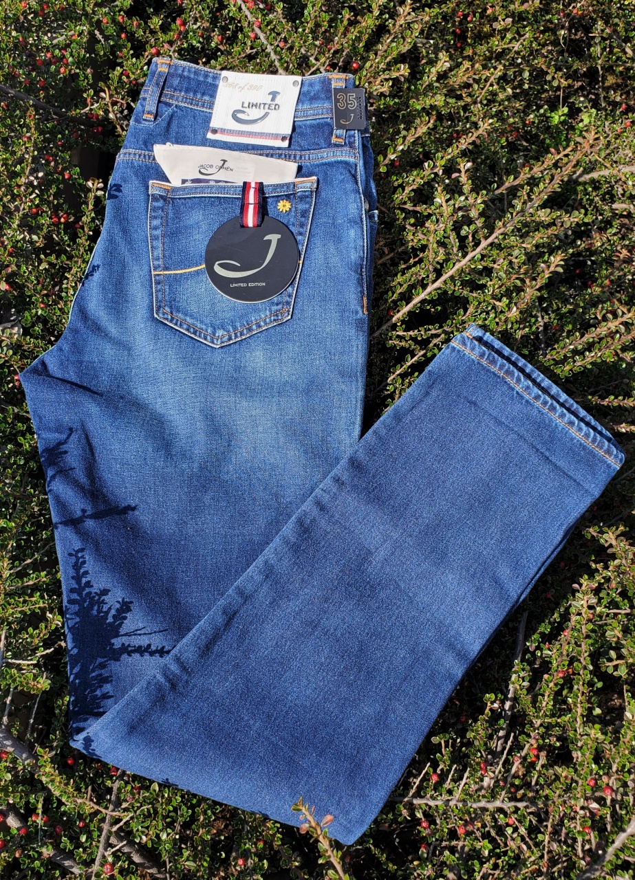 Сзади на правом бедре джинсы имеют фирменный ярлык из шелка с логотипом марки Jасоb Соhеn, выполненный из металла, что указывает на принадлежность к "лимитированной" линейке марки и порядковый номер - 368 из 390