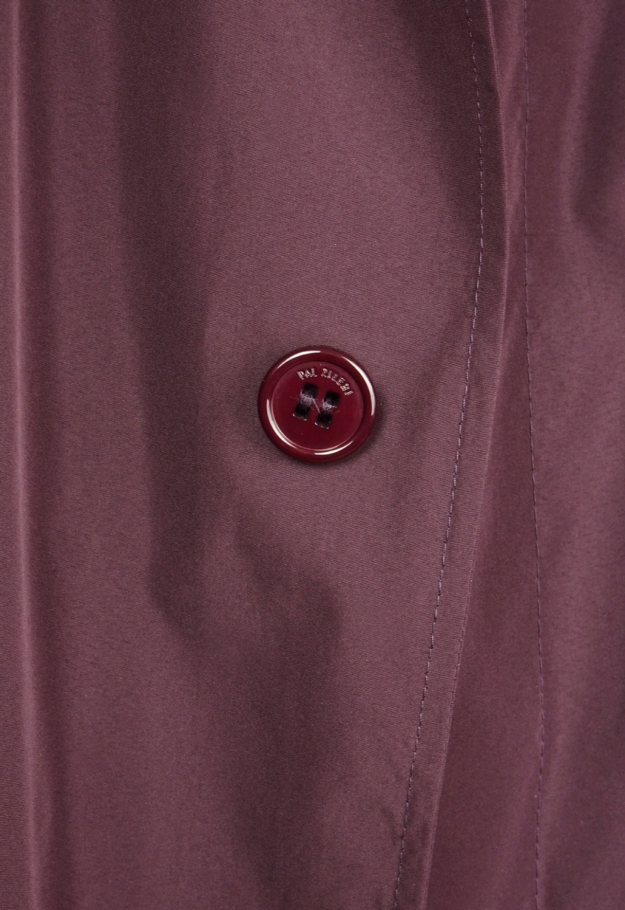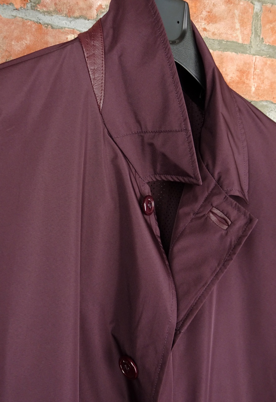 Детали (оборотная сторона воротника, петли, оторочка карманов) отделаны натуральной кожей. Причем и элементы кожаной отделки, и пуговицы - в цвет самого плаща, тоже бордовые. Пуговицы с логотипами Pal Zileri.