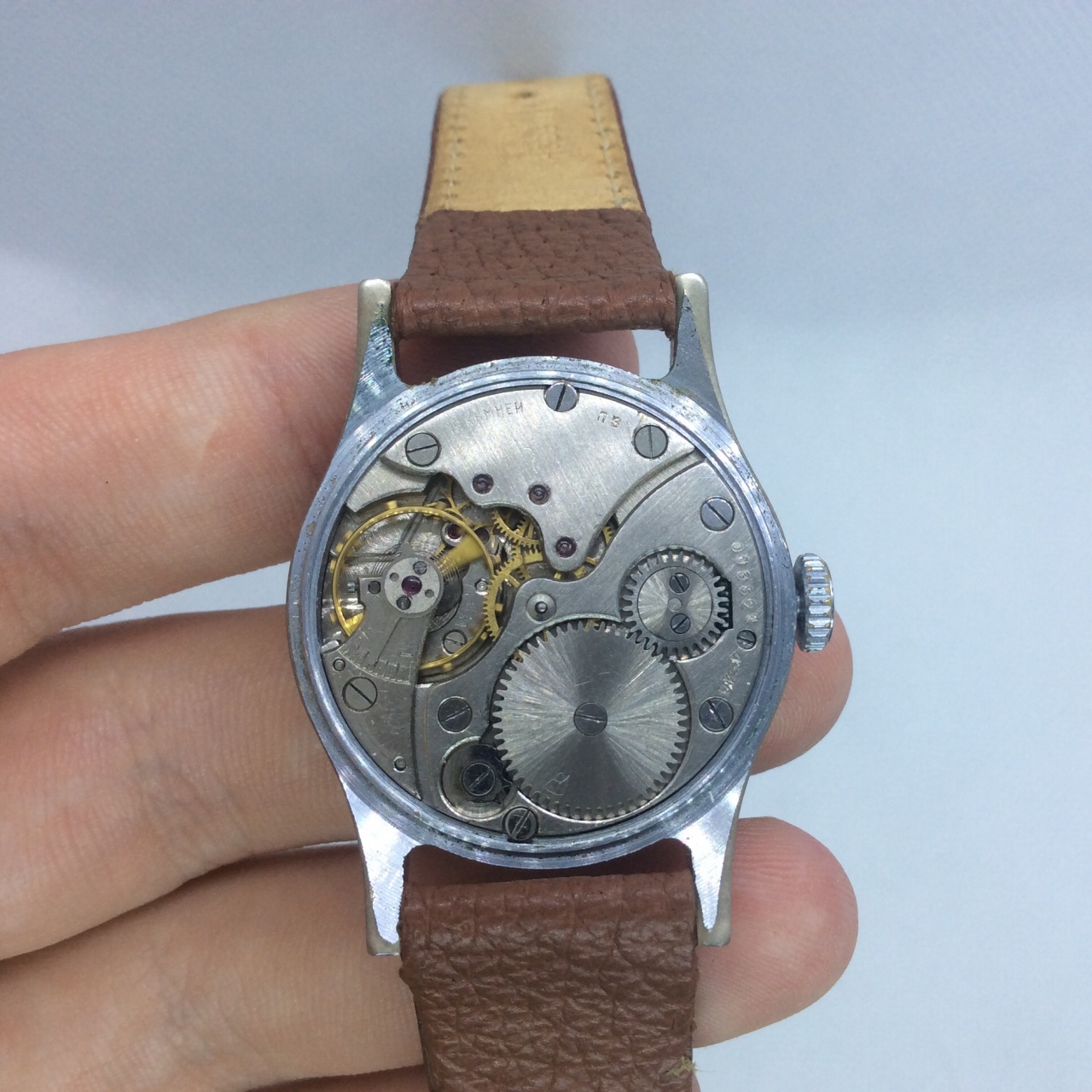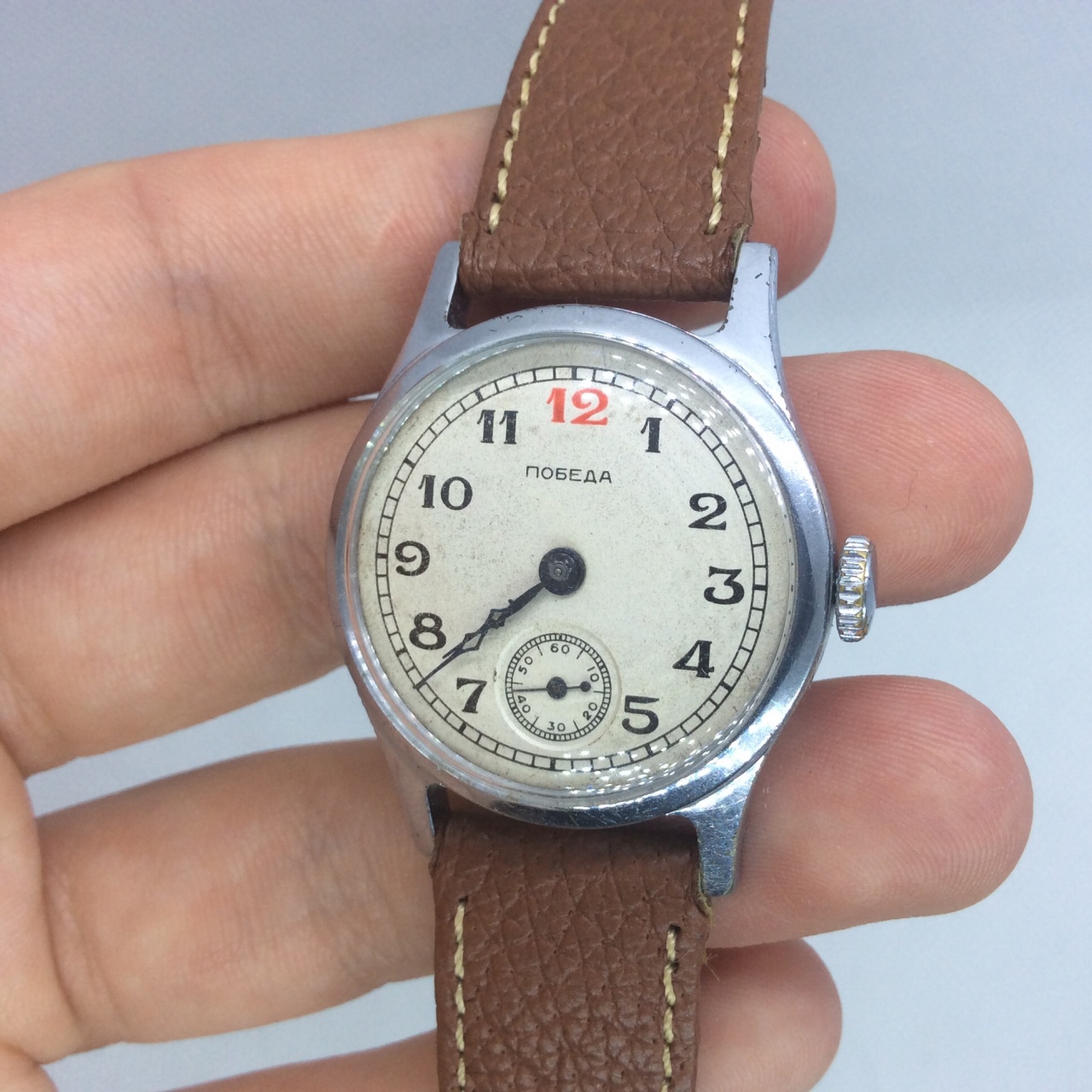 Однако циферблат не пензенский (больше склоняюсь к ЧЧЗ, но может быть и 1МЧЗ)... да и корпус атрибутировать не получается из-за ремня (у Пензы свои корпуса). Заводная головка правильная.