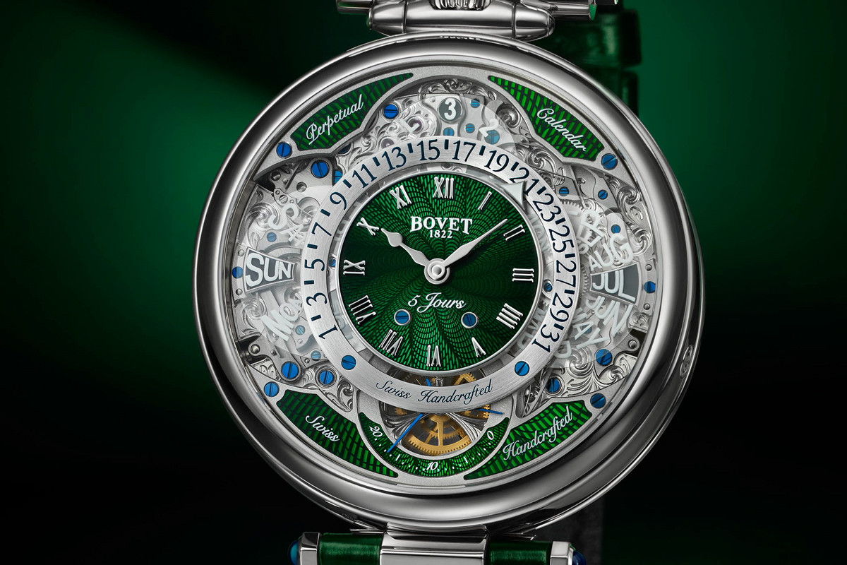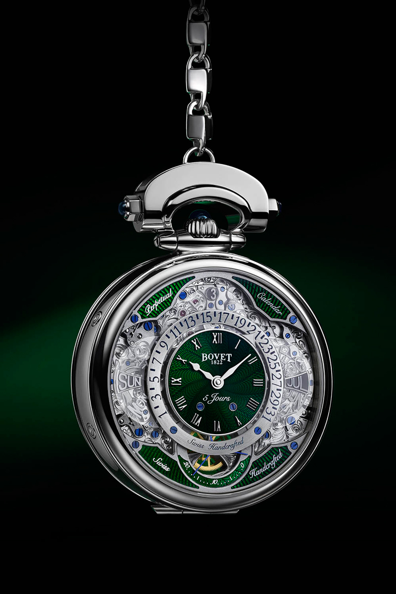Усложнения, реализованные в часах, позволяют отслеживать день недели, дату, месяц, вечный календарь и цикл високосного года. Если часы постоянно находятся в заведенном состоянии - вечный календарь Bovet не потребует никаких корректировок в течение 400 лет. Значения цикла високосного года, дня недели и месяца отображаются на трех центральных прозрачных сапфировых дисках с крупными белыми индексами. Текущие значения становятся хорошо читаемыми, когда попадают на черные зоны в положениях на 9 часов для дня недели, на 12 часов для цикла високосного года и на 3 часа для месяца, в то время как прошедшие или наступающие значения практически незаметны, оставаясь полупрозрачными. Подобное решение позволяет открыть вид на мосты механизма, покрытые затейливой ручной гравировкой с характерными мотивами Fleurisanne. Индикатор даты выполнен в форме серебряного диска, обрамляющего центральный циферблат. Текущее значение указывает треугольная стрелка, как бы парящая между центральным циферблатом и диском даты. Благодаря функции ретроградного календаря стрелка даты при достижении значения крайнего дня месяца возвращается в направлении против хода часов в начальное положение. Центральный циферблат и сектор малого секундного циферблата в районе 6 часов украшены кружевным гильоше насыщенно-глубокого изумрудно-зеленого или рубиново-красного цвета, полученного с использованием эмали. Узор гильоше повторяет форму цветка лотоса с 12 лепестками. Римские цифры и стрелки из белого золота отлично контрастируют с зеленым или красным фоном циферблата. Такое же гильоширование покрывает мосты механизма над и под центральным циферблатом, на которые нанесены надписи «Perpetual Calendar» и «Swiss Handcrafted ».