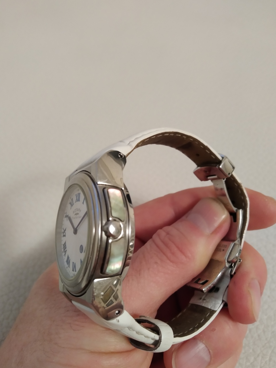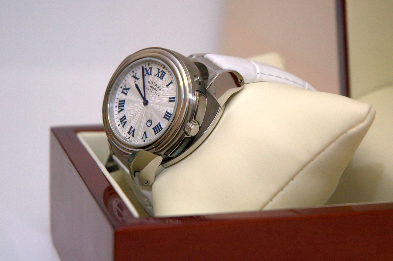 Первый - белый, гильошированный с накладными римскими цифрами синеголубого цвета, классическими стрелками и окошком даты.