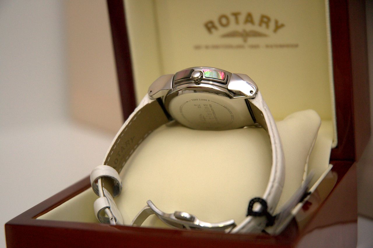 Второй - светлый, с цветочным орнаментом, золотыми стрелками и метками, а также дополнительным секундным циферблатом. Метки часов и безель украшены кристаллами Swarovski.