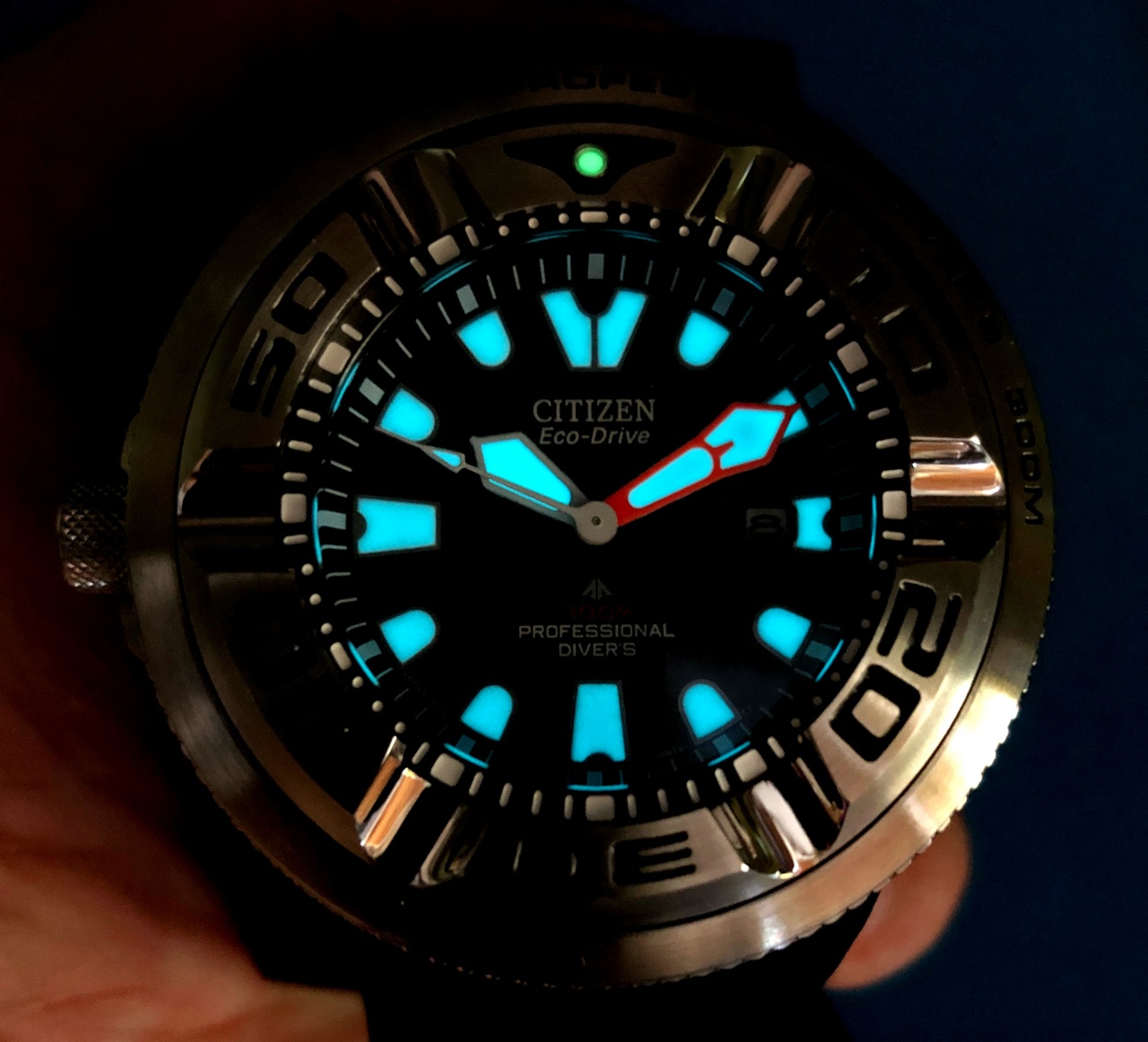 Очень яркий люм голубого цвета на стрелках и метках
